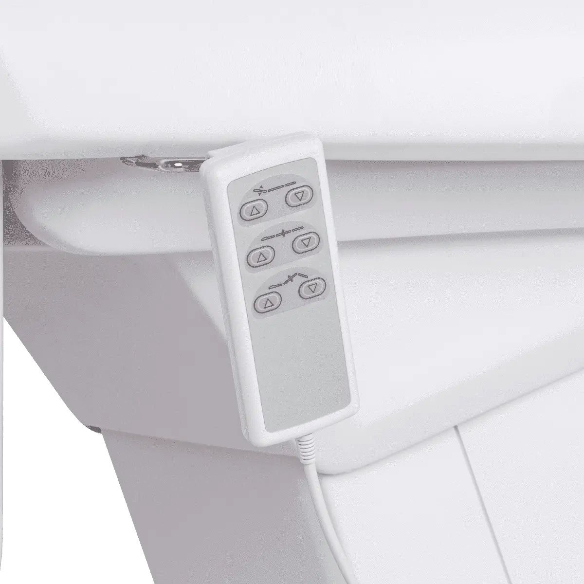 Комплектация: основание на подпятниках, каркас, мягкие элементы (сиденье, спинка и подушка под ноги, подголовник с отверстием для лица и подлокотники), электропривод 3 мотора, пульт управления.