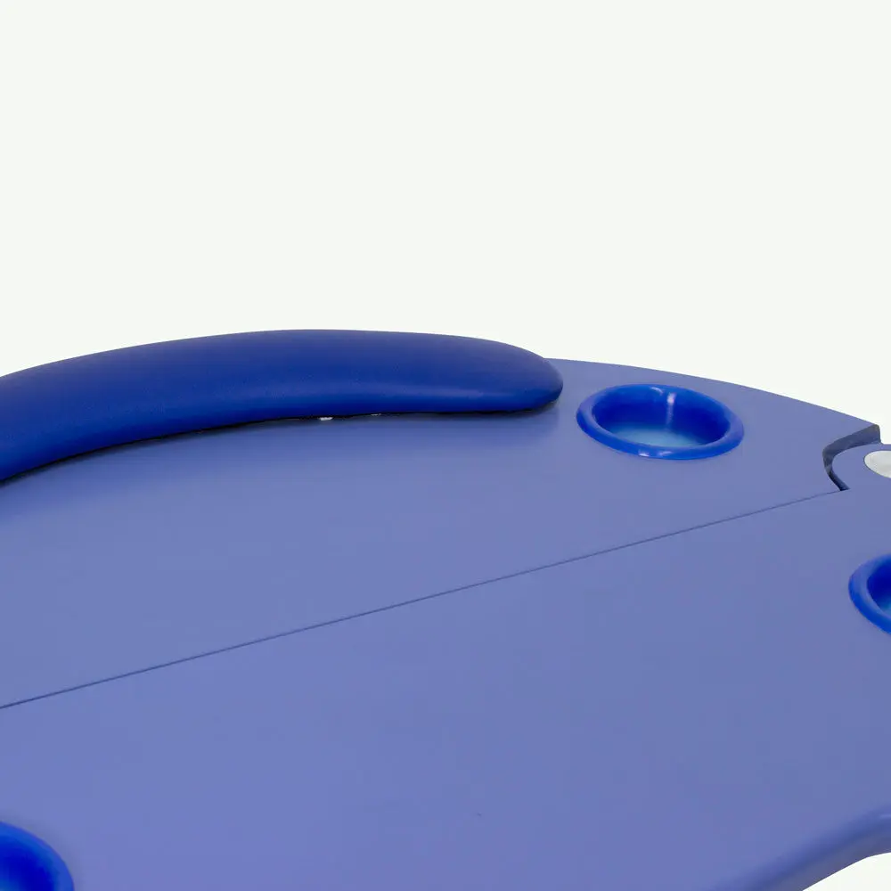 Стол маникюрный МД-9007 (раздвижной) с вместительной тумбой на колесах и хромированными ножками. Он позволяет максимально использовать пространство помещения, что очень важно при минимальной площади рабочего кабинета или для работы на дому. Круглая столешница состоит из двух частей, которые соединены металлическим креплением. В каждой части предусмотрено по два отверстия с пластиковыми емкостями для хранения различных расходных материалов, аксессуаров и прочих рабочих принадлежностей. Для изготовления столешницы применяется ДСП с ламинированным покрытием приятного синего цвета.
