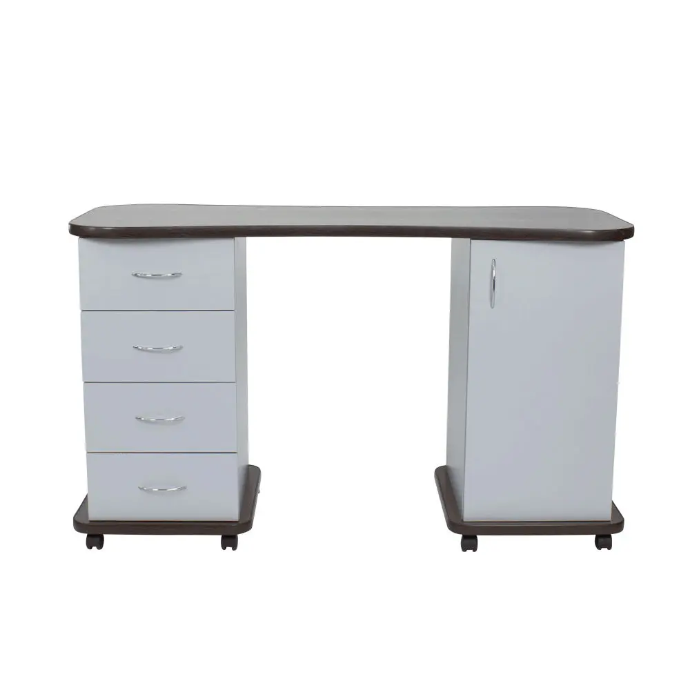 Если Вы желаете купить стильный и удобный стол для маникюра – Эсти-2 сможет полностью удовлетворить Ваши потребности. Он выполнен из качественной ламинированной ДСП, которая отличается высокой прочностью и долговечностью. Ламинированное покрытие легко очищается, не боится воздействия влаги и дезинфицирующих средств, а также длительное время сохраняет красивый внешний вид. Тумбы установлены на колеса, благодаря которым стол можно легко перемещать и поворачивать. В нашем магазине маникюрный стол Эсти-2 можно купить из наличия в цветах складкой программы (венге, венге/белый дуб), или под заказ, в любом другом цвете из каталога.