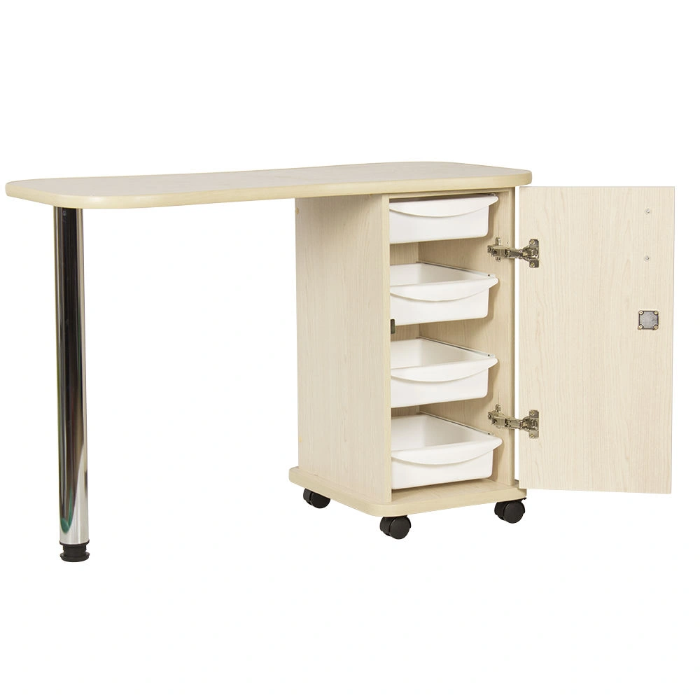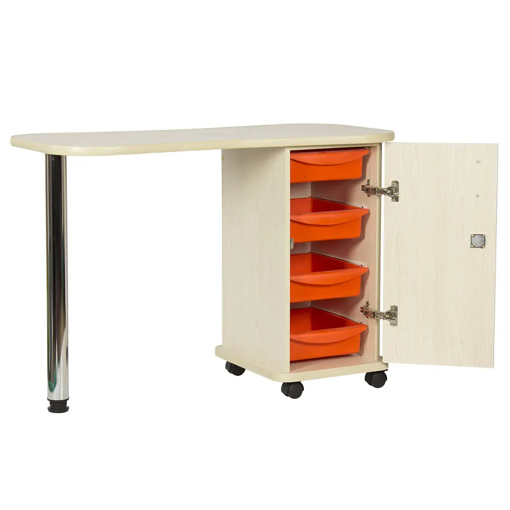 Дополнительные аппараты, оборудование и аксессуары поместятся по краям столешницы. Посредине стол имеет изогнутую форму, что делает доступ к рукам клиентов более удобным. В тумбе под столешницей есть четыре ящика, где можно систематизировать инструменты мастера. Каждый ящик легко вынимается при необходимости. В основание тумбы встроены поворотные колеса, что позволит передвинуть стол в нужную зону кабинета.