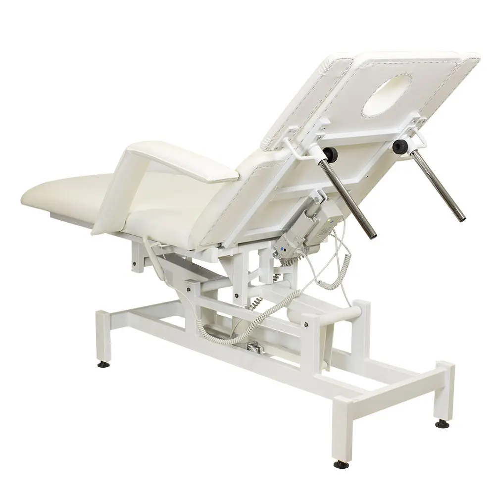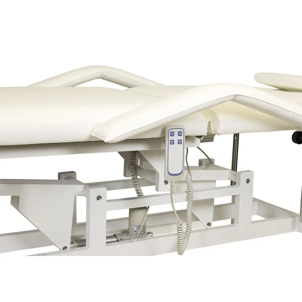 Кушетка разделена на два мягких сегмента, положение которых регулируется. С помощью двух встроенных электромоторов можно дистанционно регулировать угол наклона спинки и высоту кушетки. В комплект поставки входит удобный пульт управления электроприводом. Каркас и основание из металла с защитным покрытием.