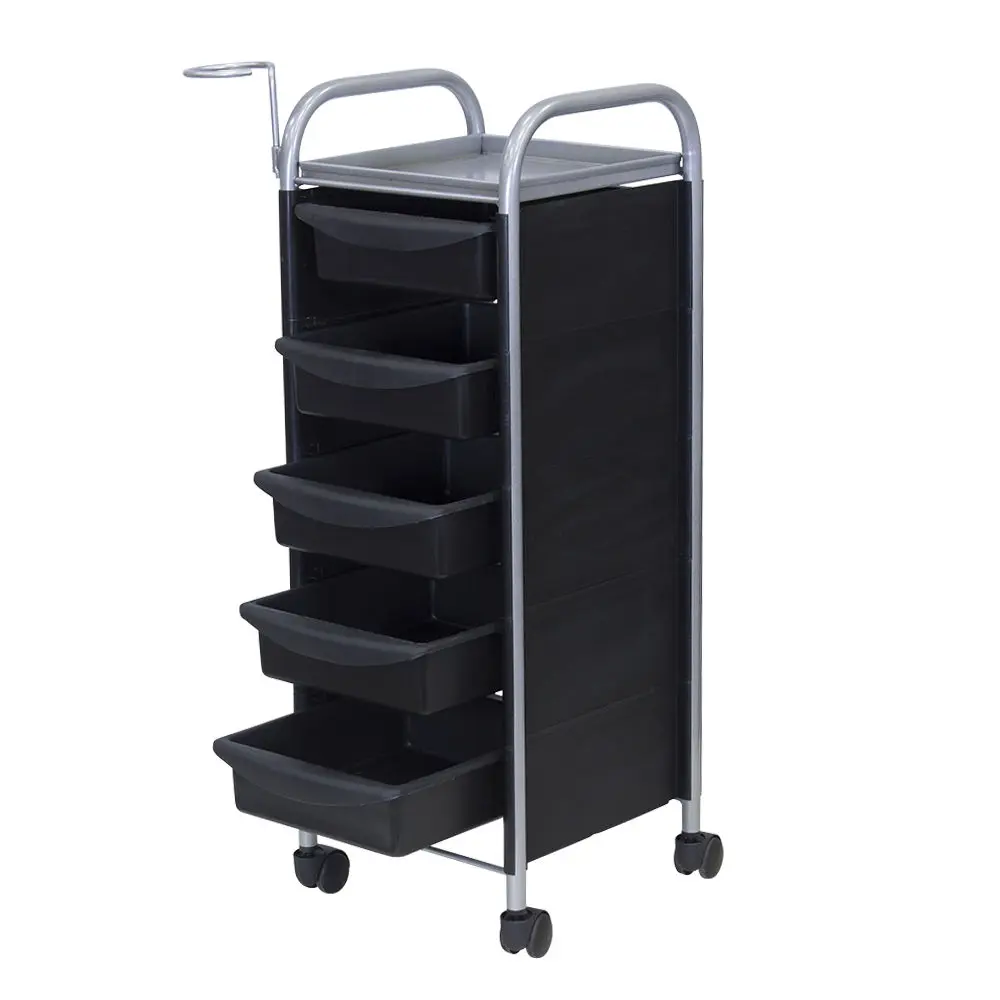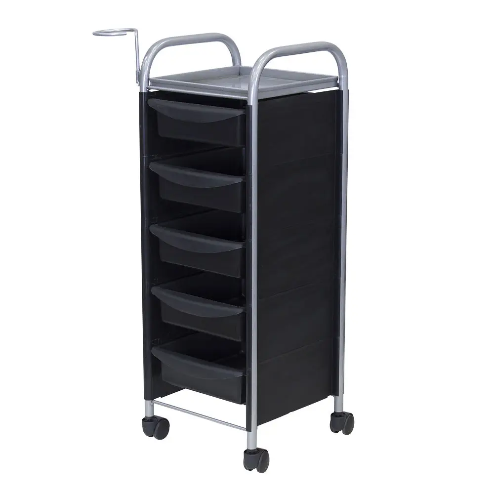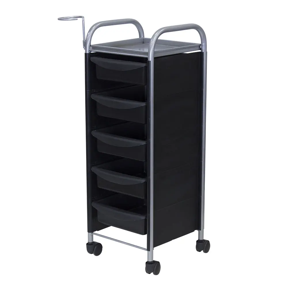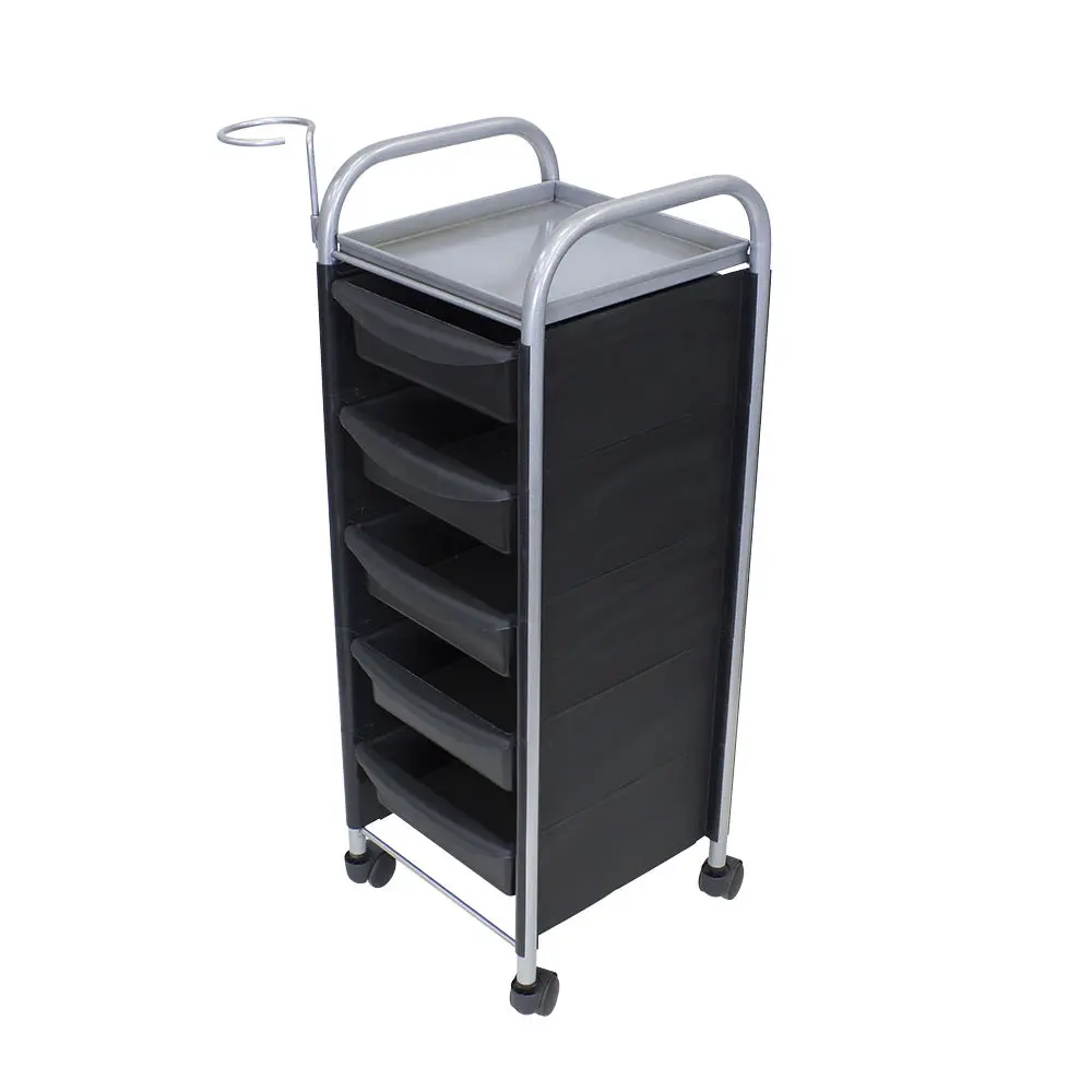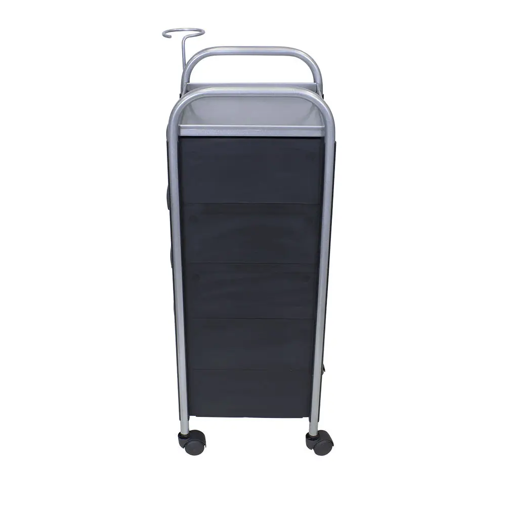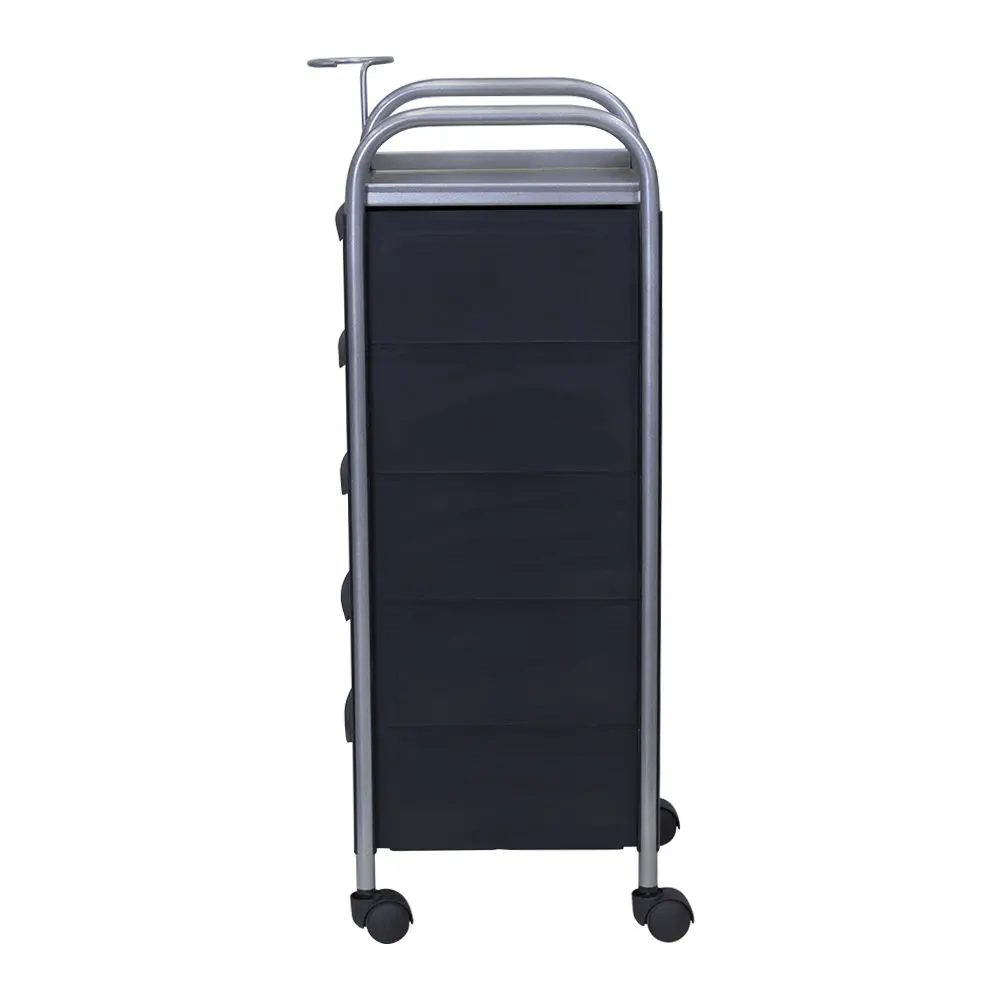 Комплектация: основа из металла на манёвренных колесиках, боковые пластиковые панели, выдвижные ящики (5 штук), верхняя полка.