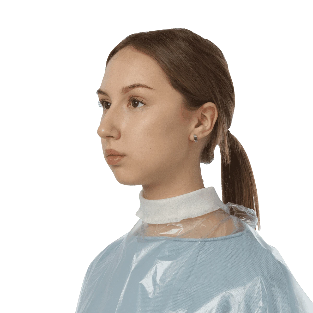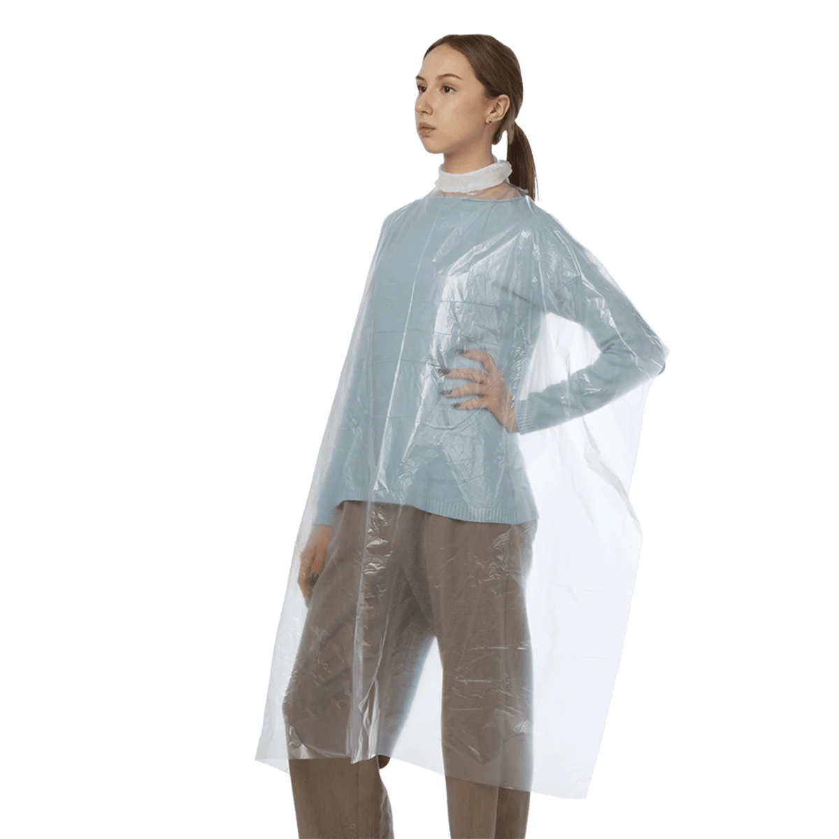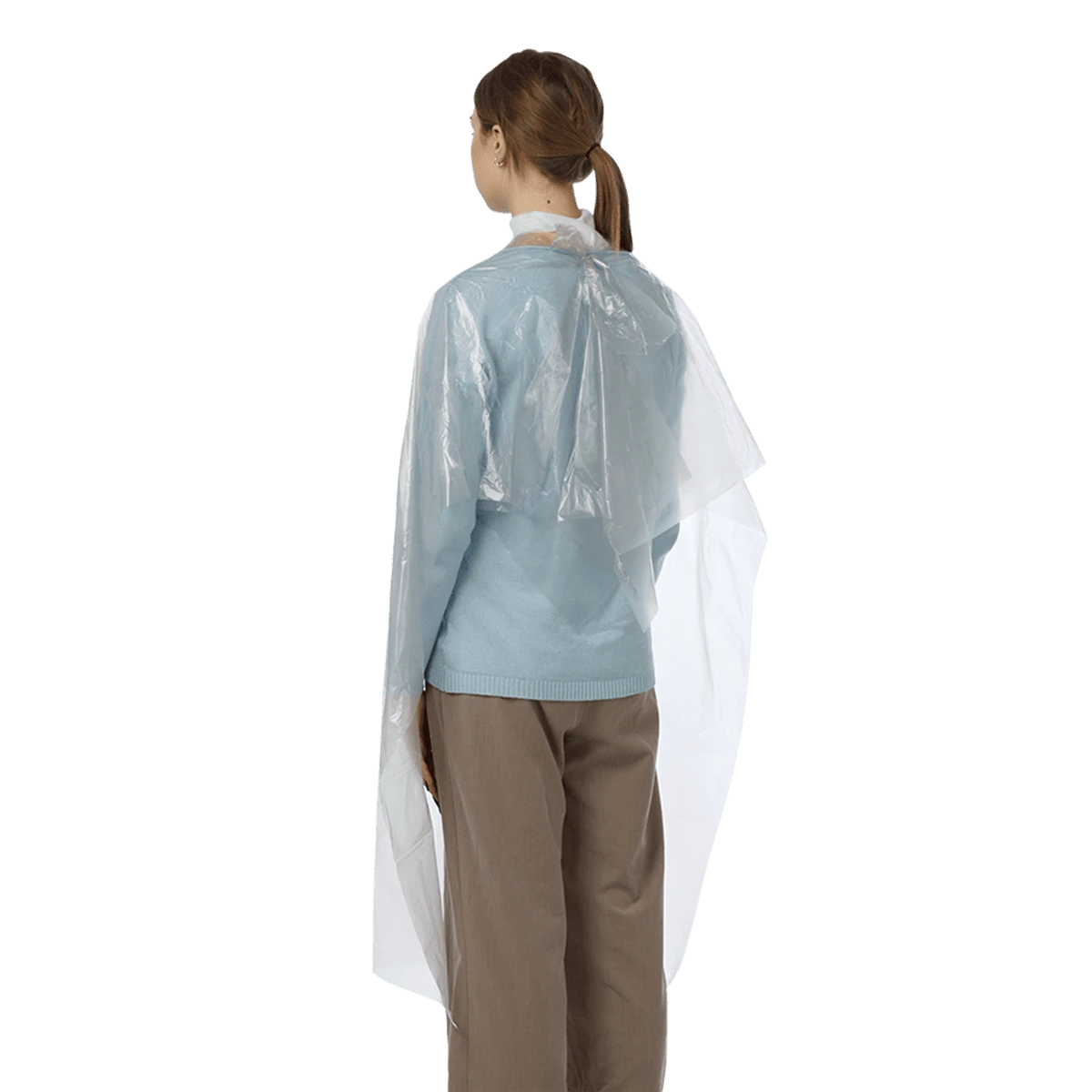 Пеньюар стандарт из полиэтилена может применяться в парикмахерской сфере во время выполнения процедуры стрижки, окрашивания или химической завивки волос для защиты кожи и одежды клиента.