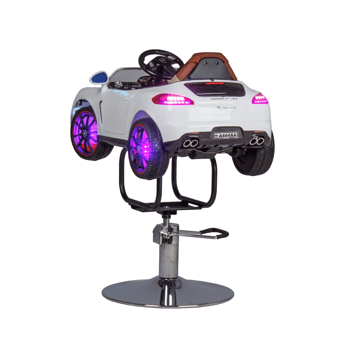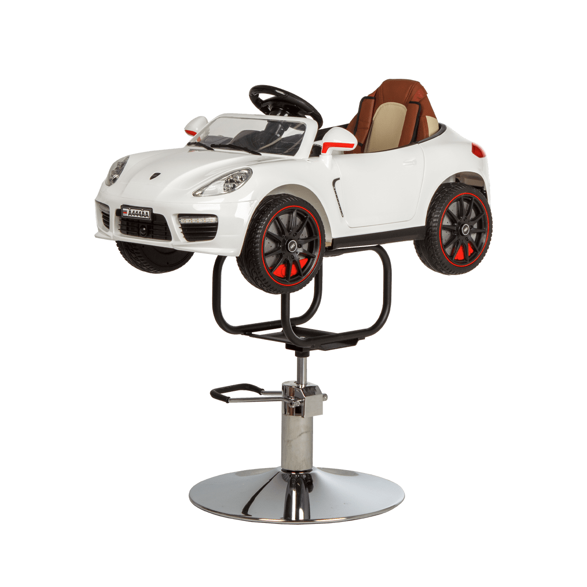 Стильное детское парикмахерское кресло машинка 01 – отличный выбор для комфорта маленьких посетителей бьюти салонов. Модель выполнена в виде белой гоночной машинки BMW с ярким привлекательным дизайном. В ней есть ключ зажигания, при повороте которого включаются фары и задние фонари. Для удобства малыша автомобиль оснащен комфортным сиденьем с высокой спинкой. Машинка установлена на металлический каркас и устойчивое хромированное основание в форме диска. Высота кресла регулируется с помощью надежного гидравлического подъемника. Данная модель подходит для детей от 3 до 6 лет.