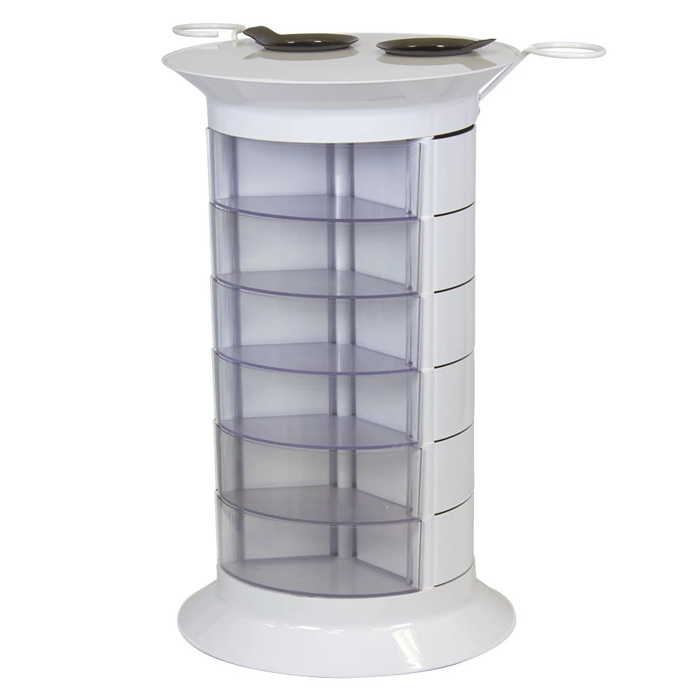 Основание тележки изготовлено из прочного металла, который надежно защищен от влаги и коррозии. Ящики выполнены из качественного пластика. Материал отлично моется, дезинфицируется и не портиться при случайном попадании косметических препаратов. Колеса, изготовленные из пластмассы, не поцарапают напольное покрытие.