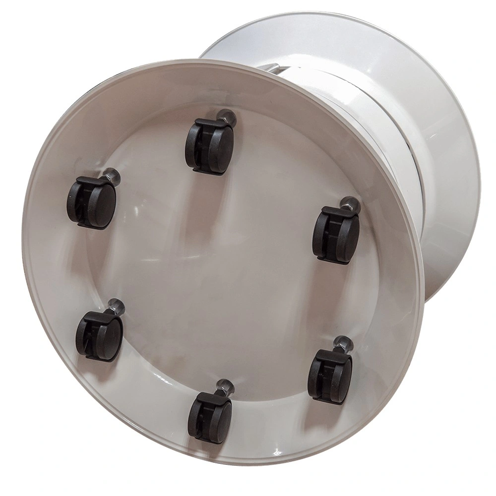 Продуманная конструкция позволит мастеру хранить все свои приспособления в одном месте. В распоряжении специалиста 16 раздвижных ящичков, которые поворачиваются вокруг стоек каркаса. Чтобы в тумбе можно было поставить высокие сосуды, с одной стороны отсутствует два ящика. Верхняя полка имеет специальные отверстия, предназначенные для емкостей и чаш. С двух сторон крышка оборудована держателями для фенов. Мобильность мебели обеспечивается шестью поворотными колесиками. Тележка может быть использована для обстановки двух рабочих мест.