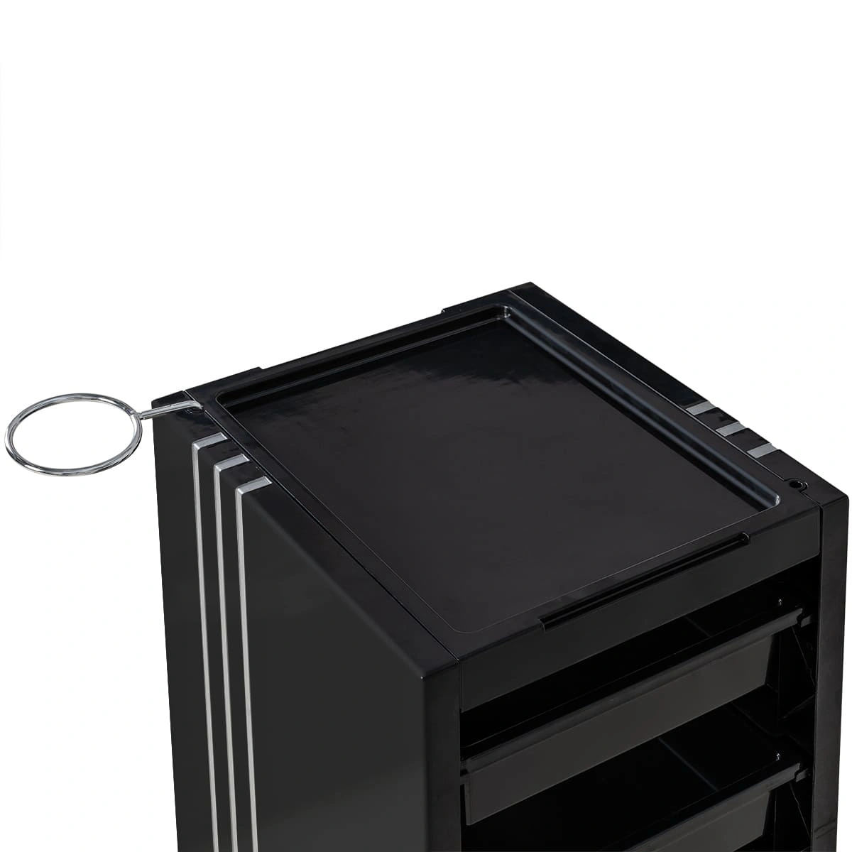 У парикмахерской тележки стильный прямоугольный дизайн с острыми углами. Верхняя крышка с фенодержателем и углублением для инструментов и баночек красоты, 5 вместительных выдвижных ящиков, это позволит мастеру организовать рабочее пространство и повысить эффективность работы.
