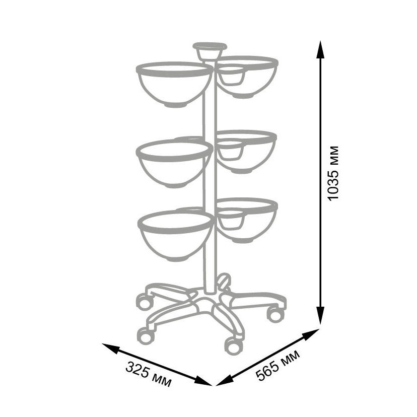 Комплектация: каркас, шесть больших и семь маленьких чаш, металлические держатели для чаш, основание на колесах.