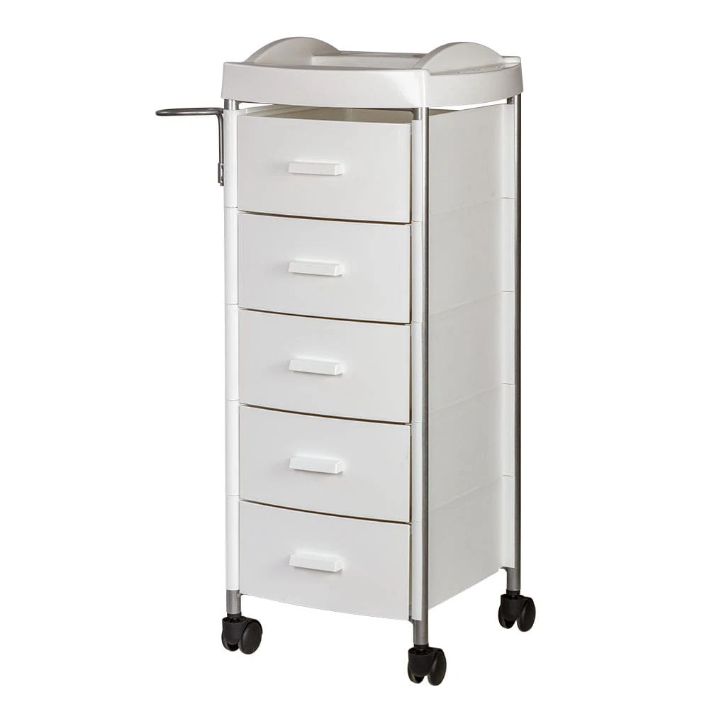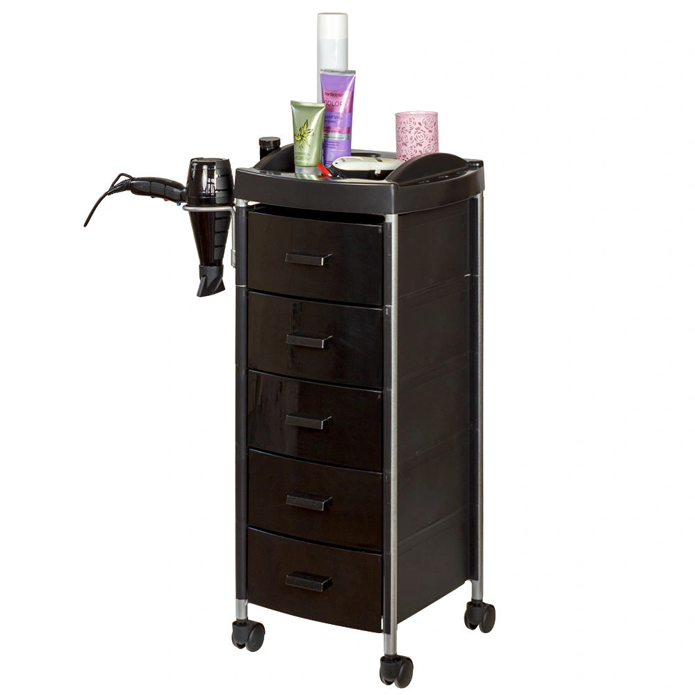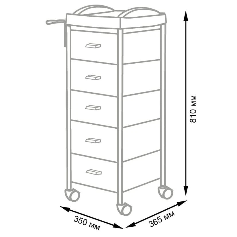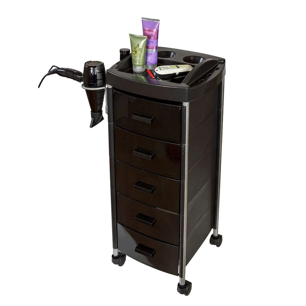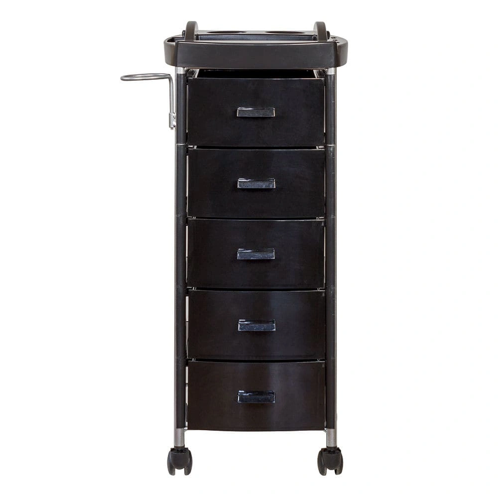 Для инструментов и расходных материалов в парикмахерской тележке есть пять вместительных ящиков. На верхней полке удобно поставить приспособления, используемые в работе. На боковой стене есть удобный держатель для фена. Легкое и бесшумное перемещение обеспечено маневренными колесами.