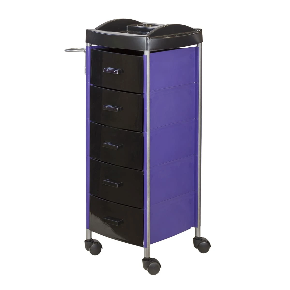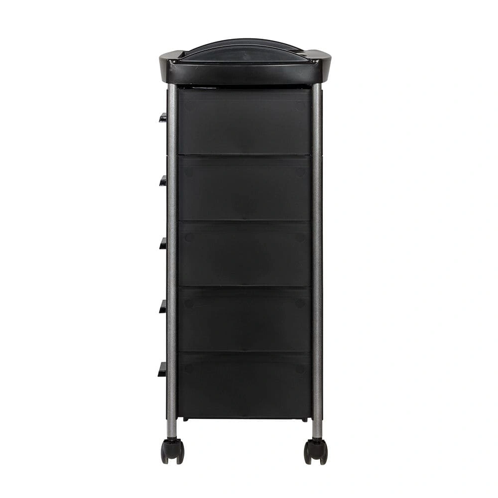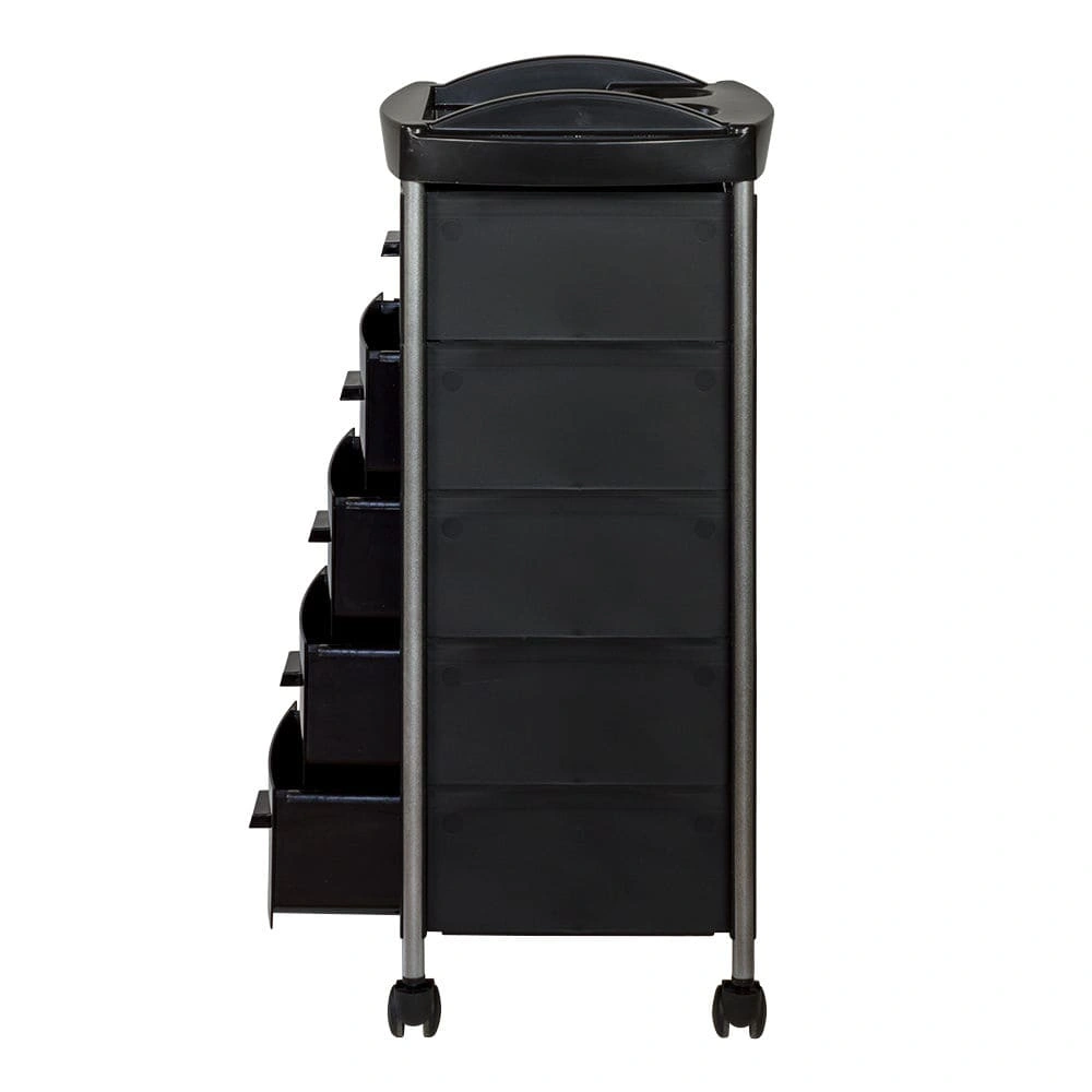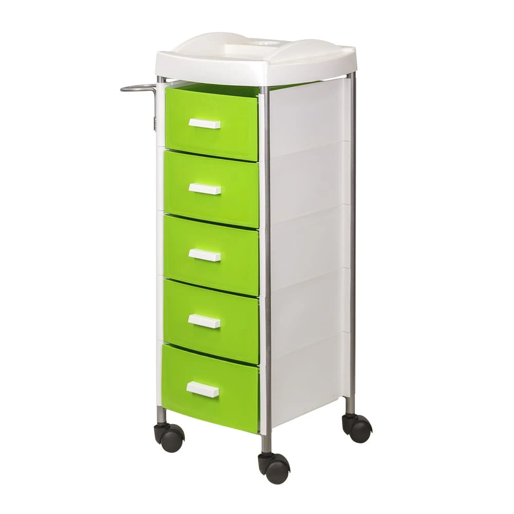 Для инструментов и расходных материалов в парикмахерской тележке есть пять вместительных ящиков. На верхней полке удобно поставить приспособления, используемые в работе. На боковой стене есть удобный держатель для фена. Легкое и бесшумное перемещение обеспечено маневренными колесами.