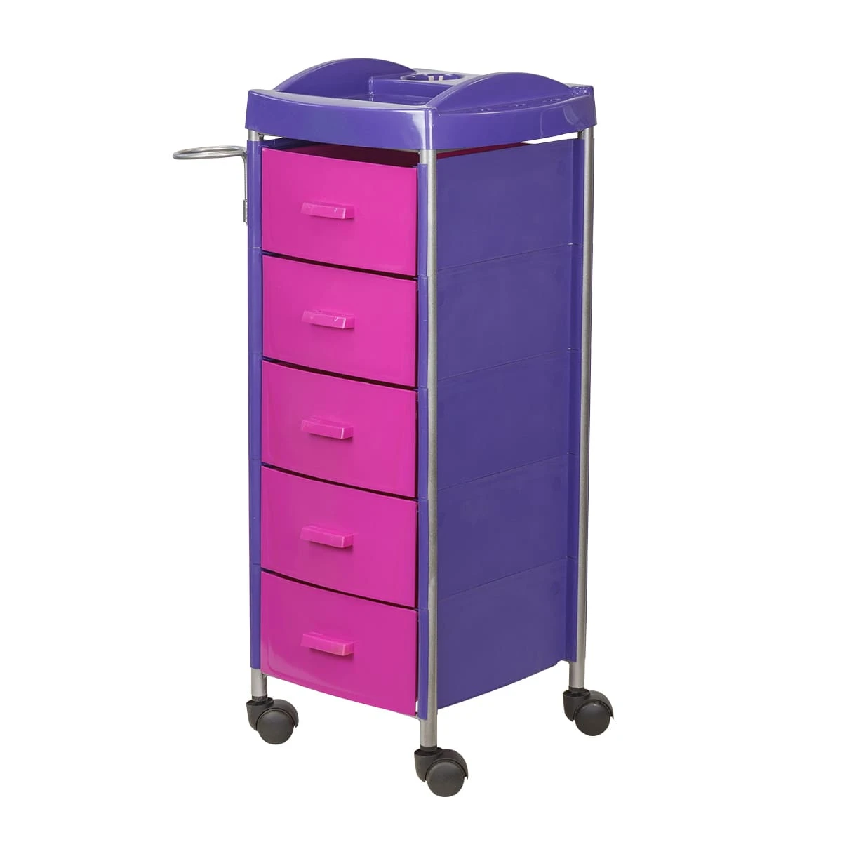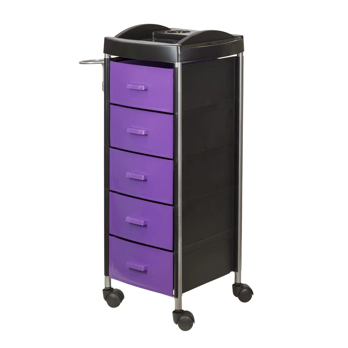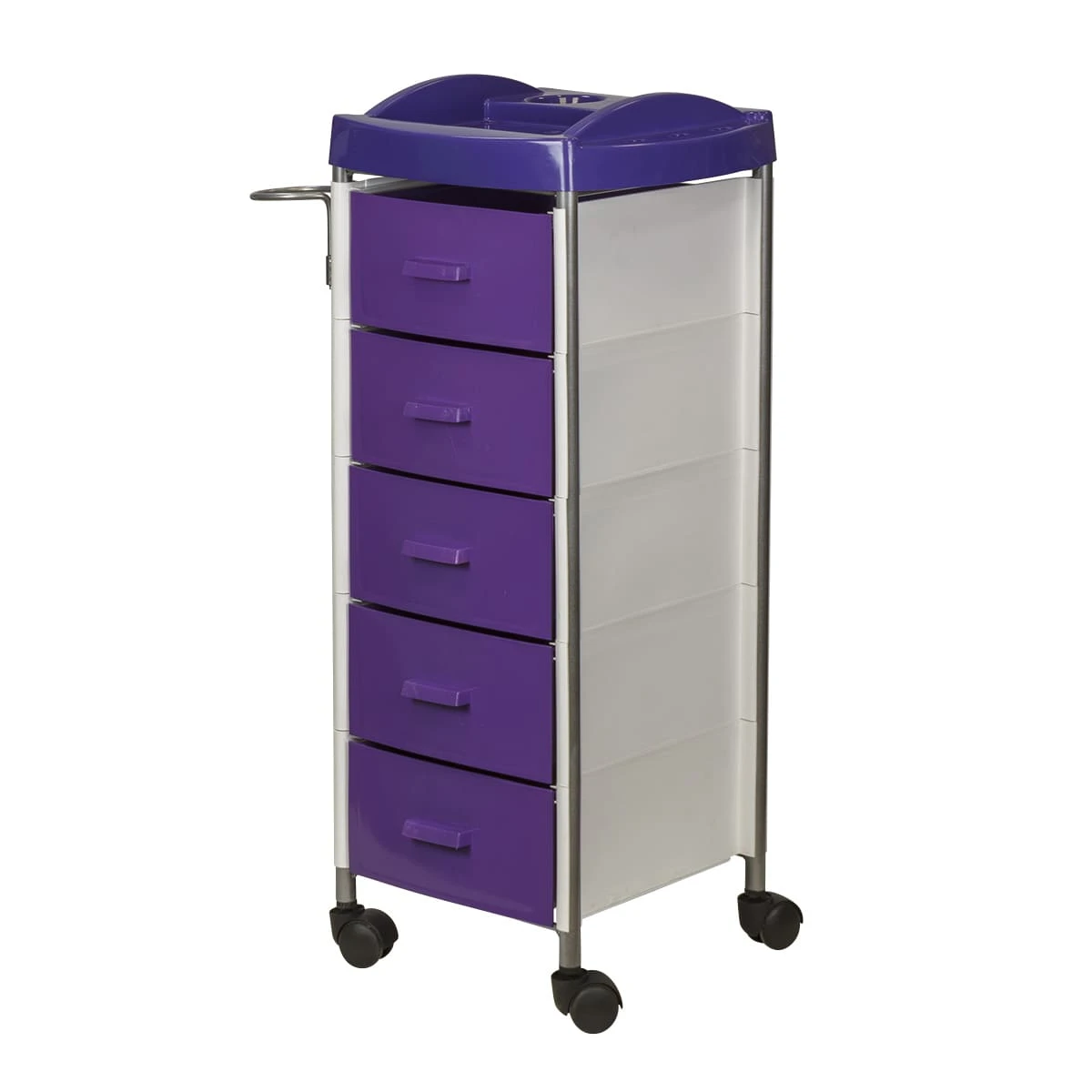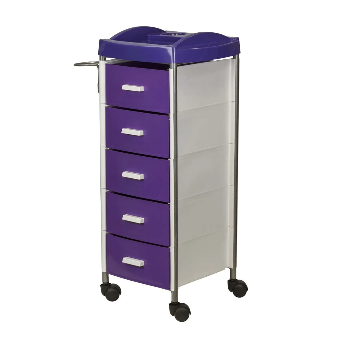 Для инструментов и расходных материалов в парикмахерской тележке есть пять вместительных ящиков. На верхней полке удобно поставить приспособления, используемые в работе. На боковой стене есть удобный держатель для фена. Легкое и бесшумное перемещение обеспечено маневренными колесами.