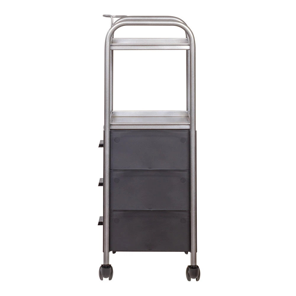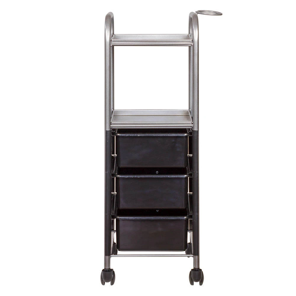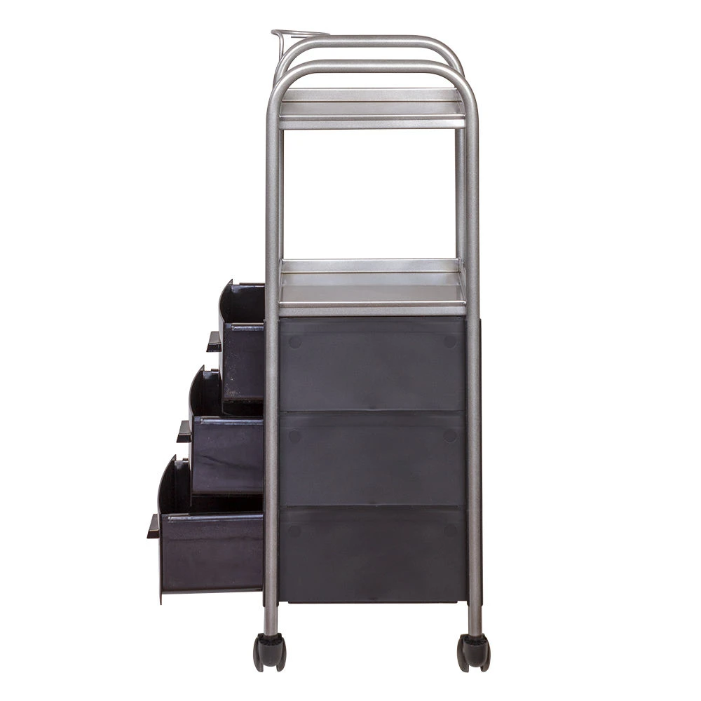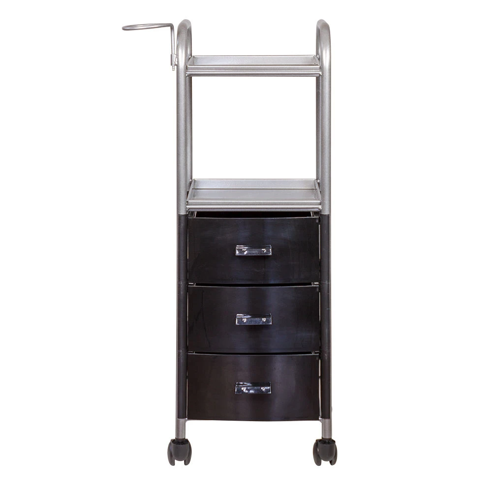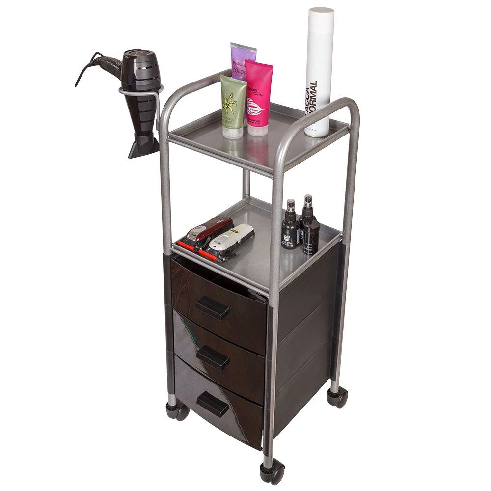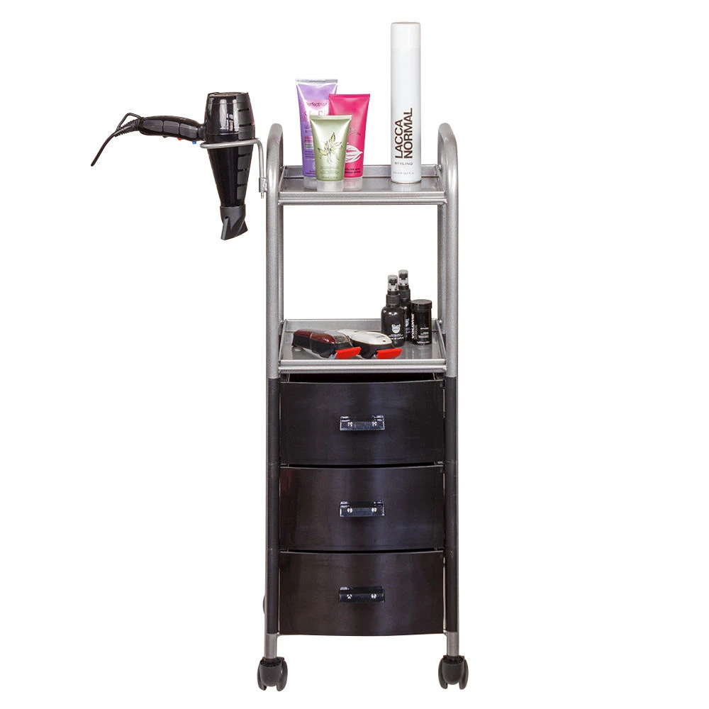 На двух полках достаточно места, что расставить инструменты, аксессуары и расходные материалы первой необходимости. В трех ящиках много места для хранения остальных приспособлений. Удачное дополнение парикмахерской тележки – удобный держатель для фена на боковине. Благодаря встроенным колесикам можно передвинуть тележку в нужное место.