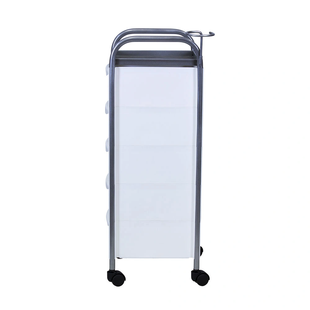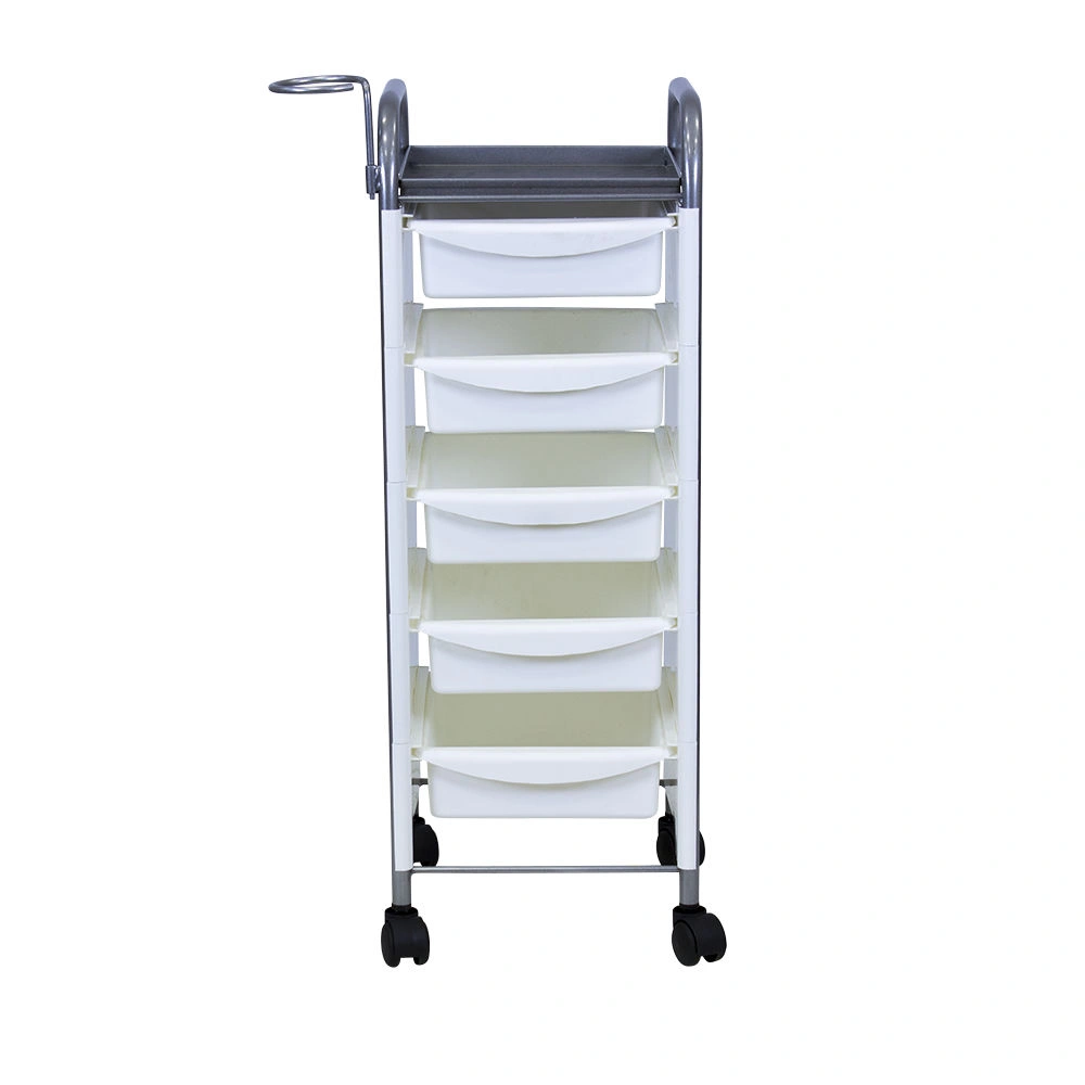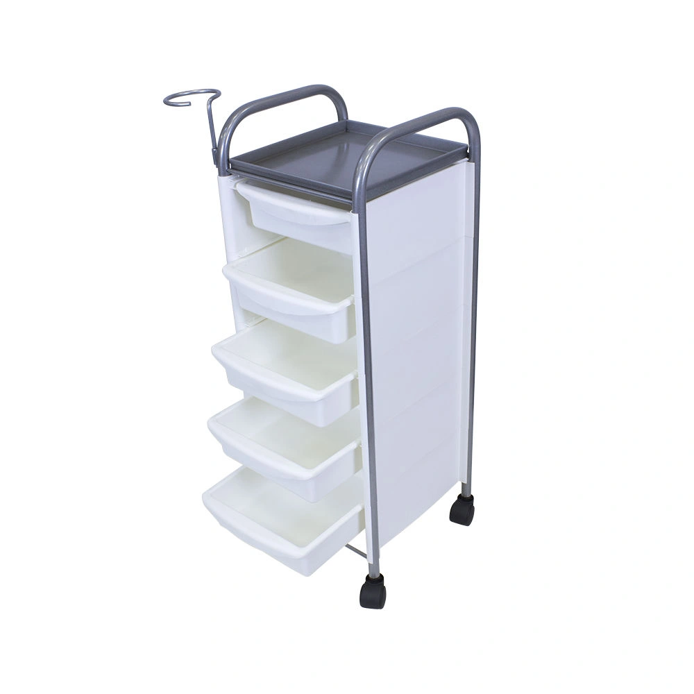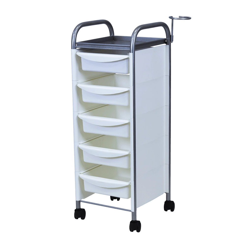 Комплектация: каркас из металла на пластиковых колесах, боковые пластиковые панели, выдвижные ящики, верхняя полка, металлический держатель для фена.