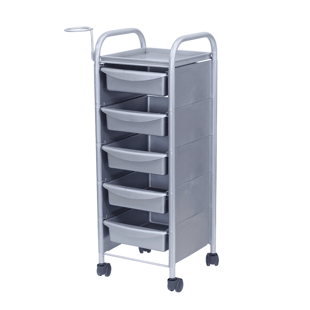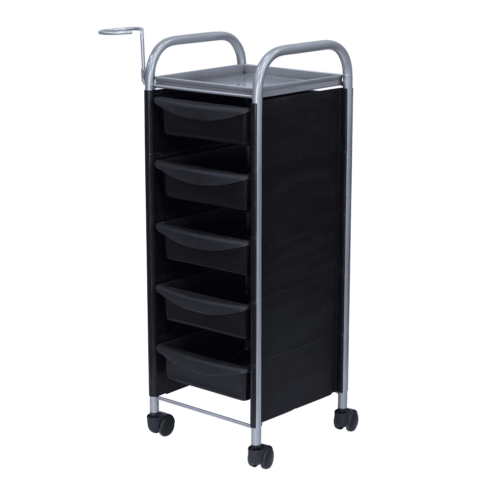 Купить тележку парикмахерскую М-02 можно с пятью вместительными выдвижными ящиками из ударопрочного пластика. Также для инструментов и прочих рабочих принадлежностей предусмотрена функциональная полочка. Для дополнительного удобства во время работы к каркасу прикреплен съемный фенодержатель. В нашем магазине парикмахерская тележка М-02 представлена в черном, сером, красном и белом цвете.