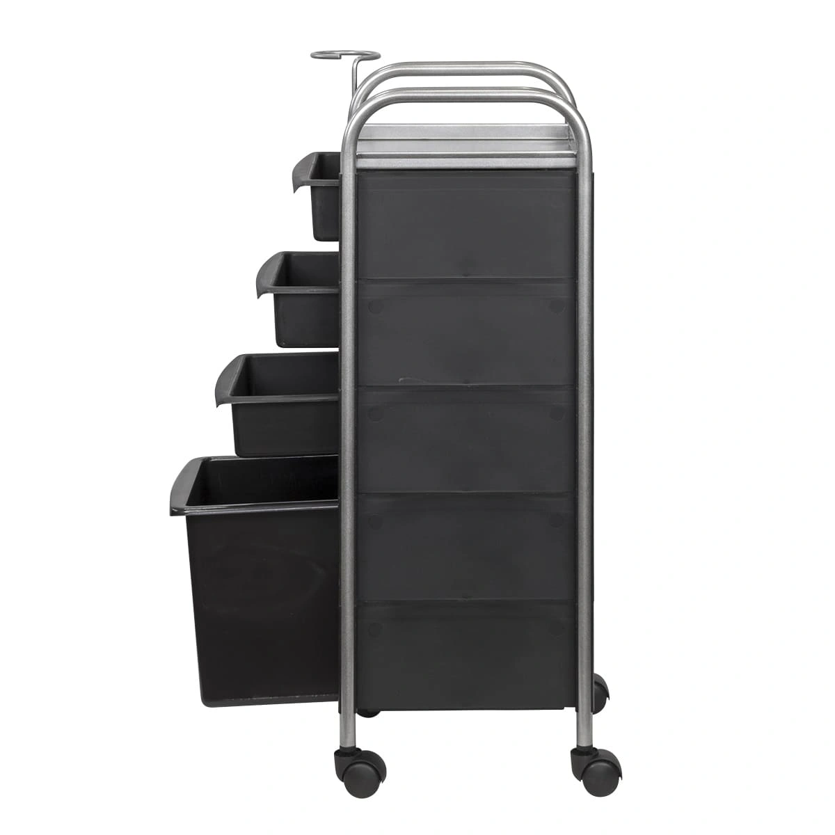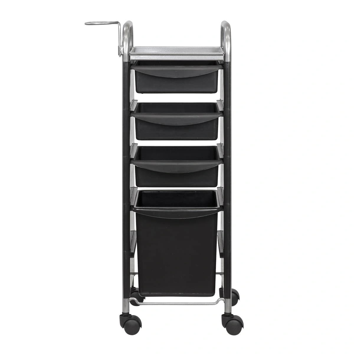 Для инструментов в парикмахерском оборудовании предусмотрено 3 выдвижных ящика. При необходимости каждый лоток можно вынимать. Верхняя полка поможет мастеру держать инструмент необходимый во время проведения процедур. Большой бак создан для косметических отходов. Благодаря поворотным колесикам столик можно переместить в любую точку салона.