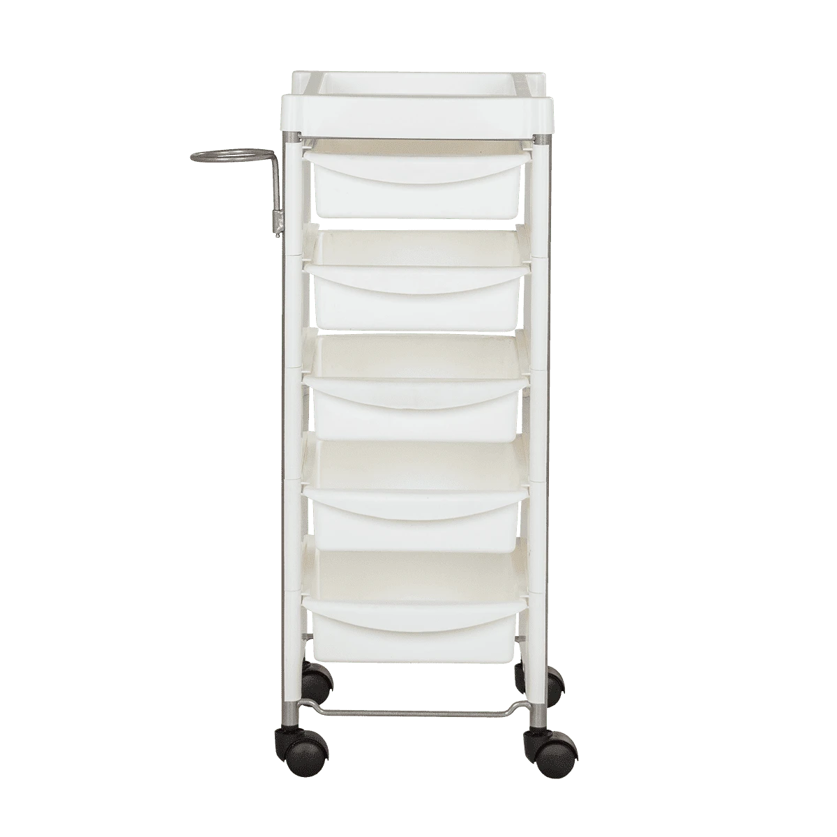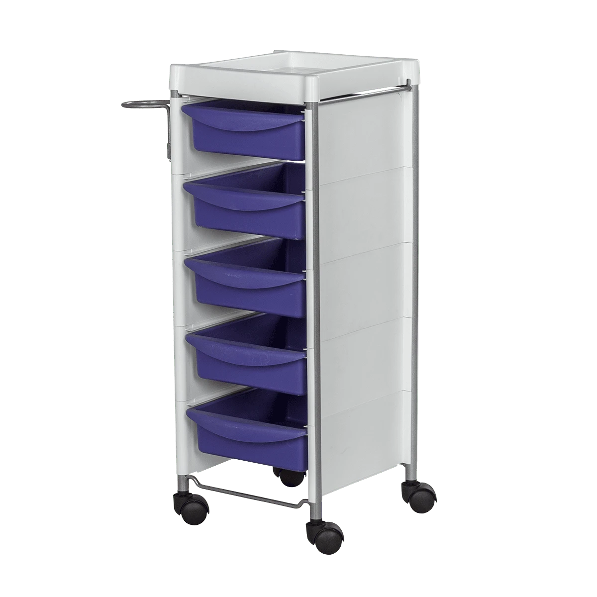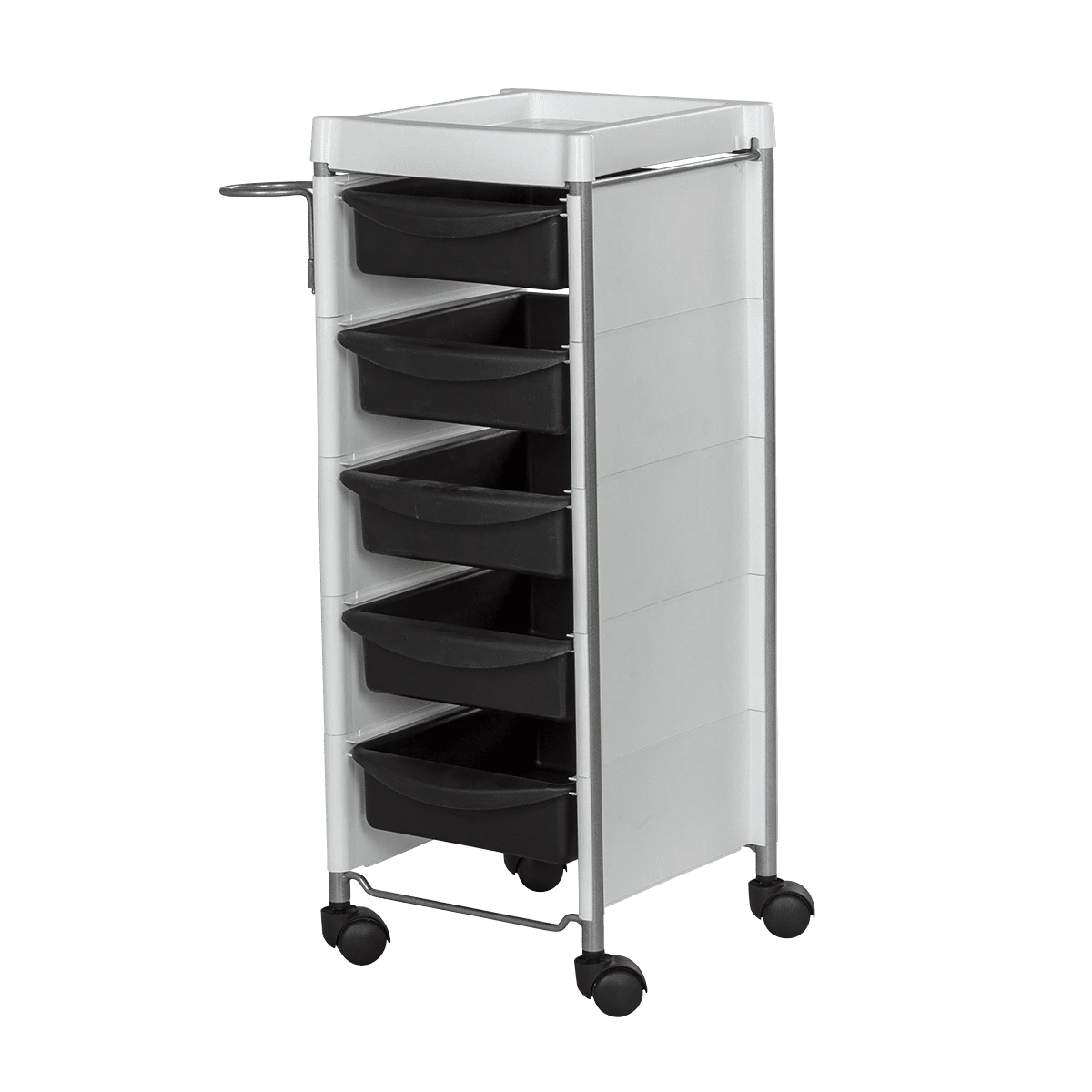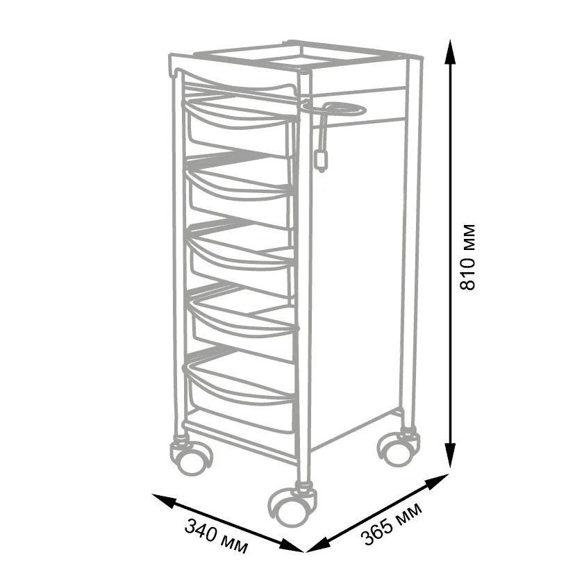 Комплектация: каркас с боковинами на колесах, ящики из пластика (5шт.), пластиковая полочка, держатель для фена, пластиковые боковины.