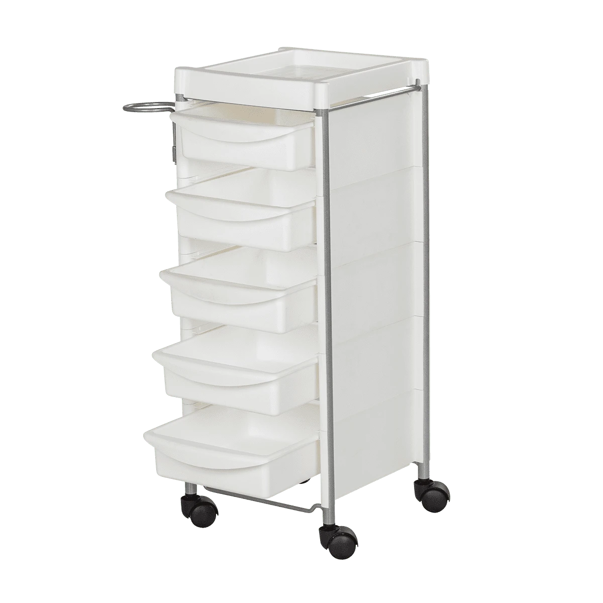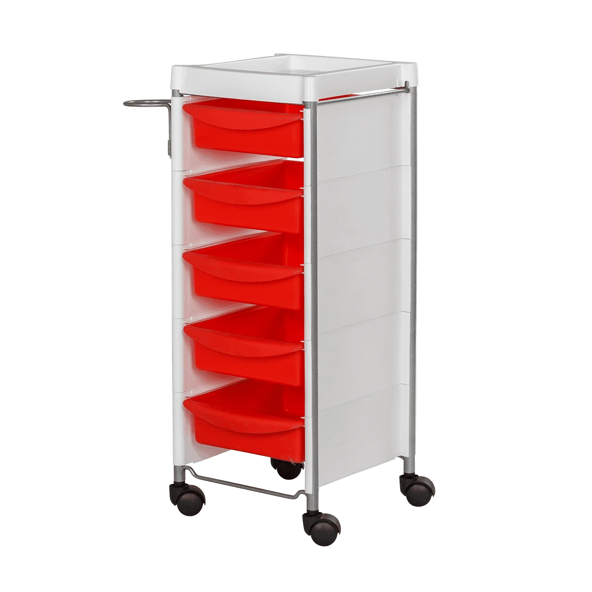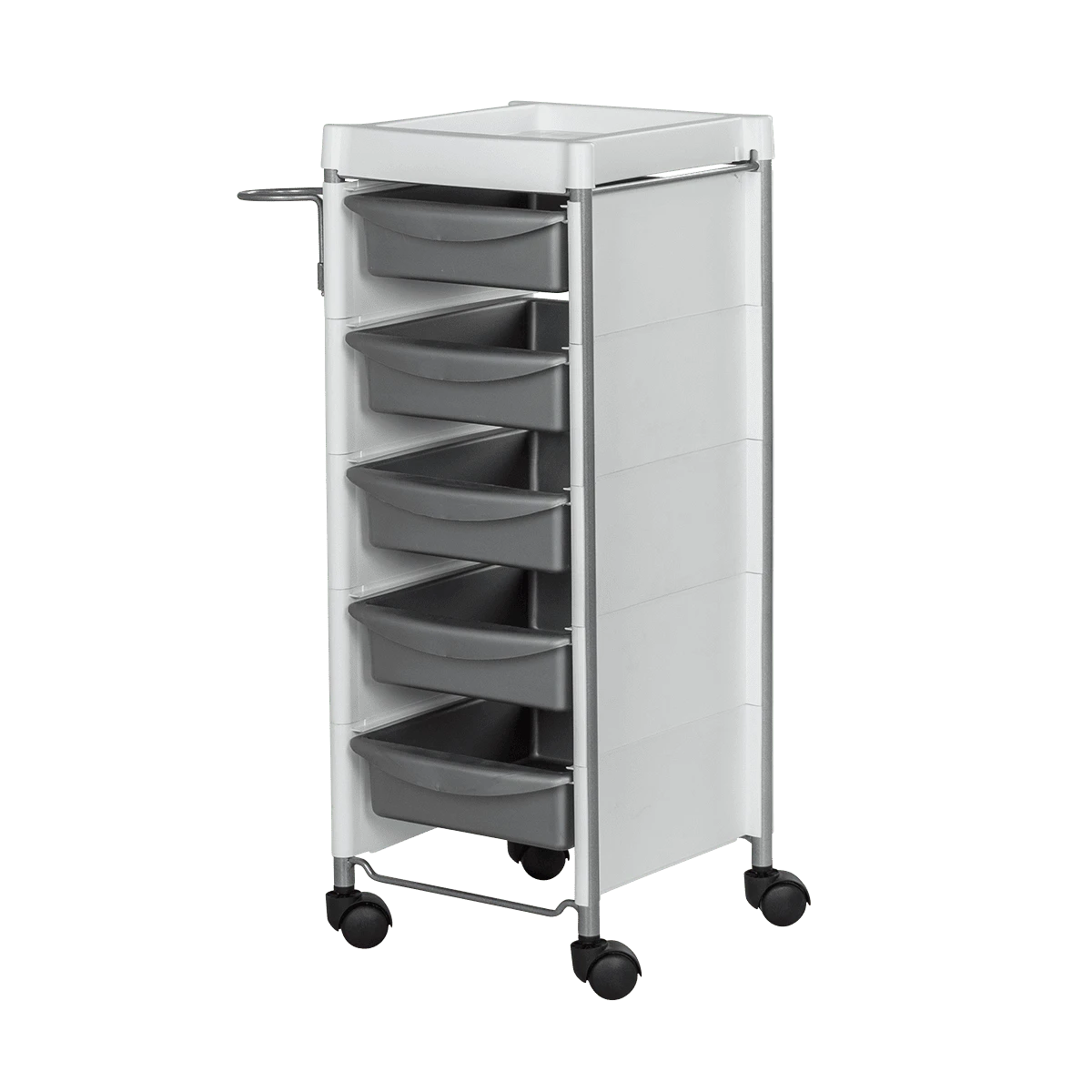 Комплектация: каркас с боковинами на колесах, ящики из пластика (5шт.), пластиковая полочка, держатель для фена, пластиковые боковины.