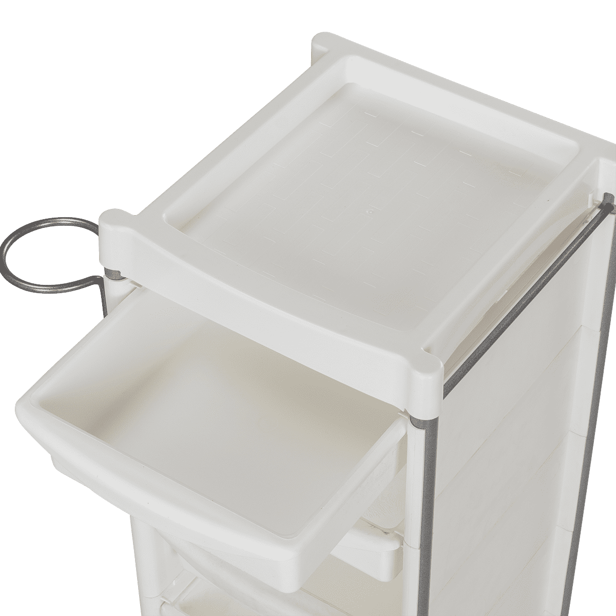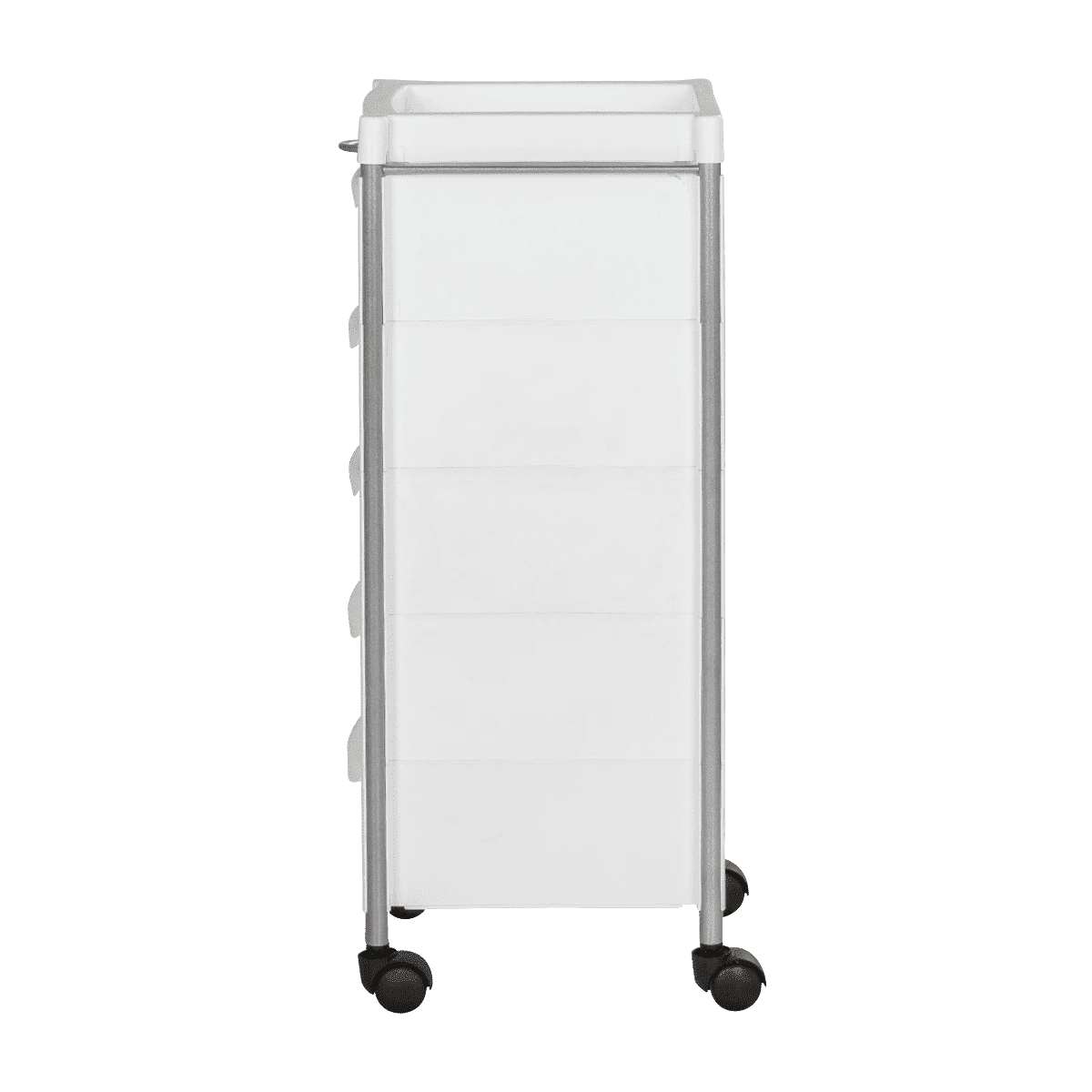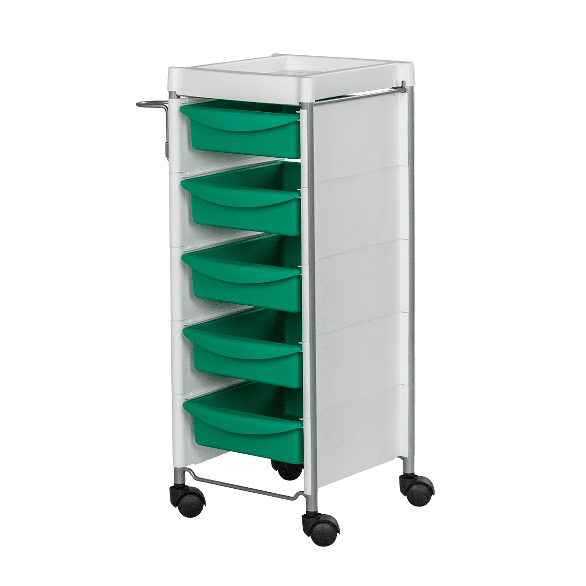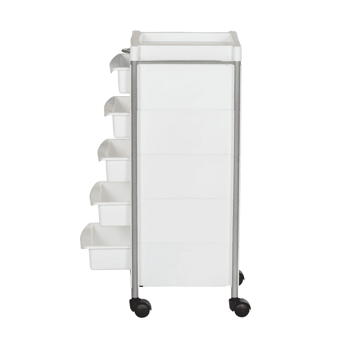 Комплектация: каркас с боковинами на колесах, ящики из пластика (5шт.), пластиковая полочка, держатель для фена, пластиковые боковины.