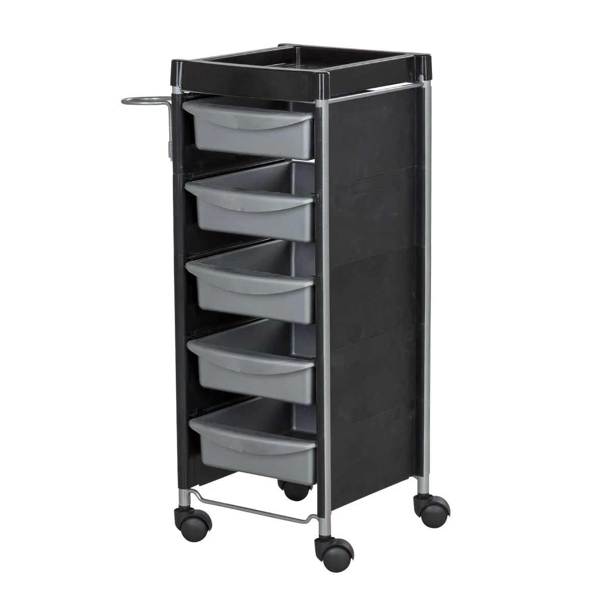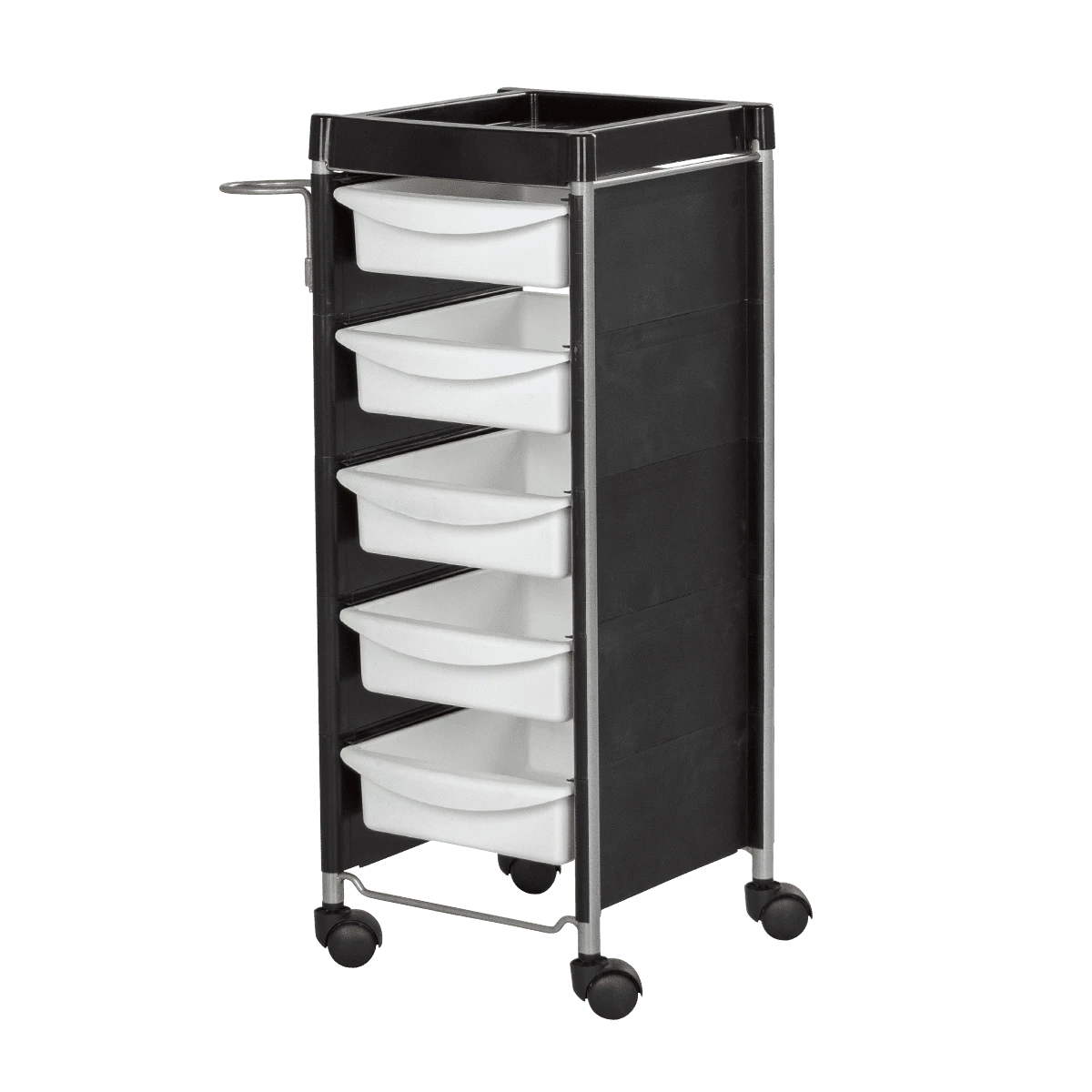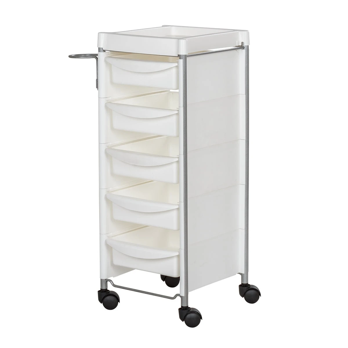 Комплектация: каркас с боковинами на колесах, ящики из пластика (5шт.), пластиковая полочка, держатель для фена, пластиковые боковины.