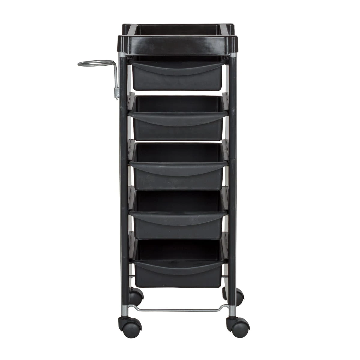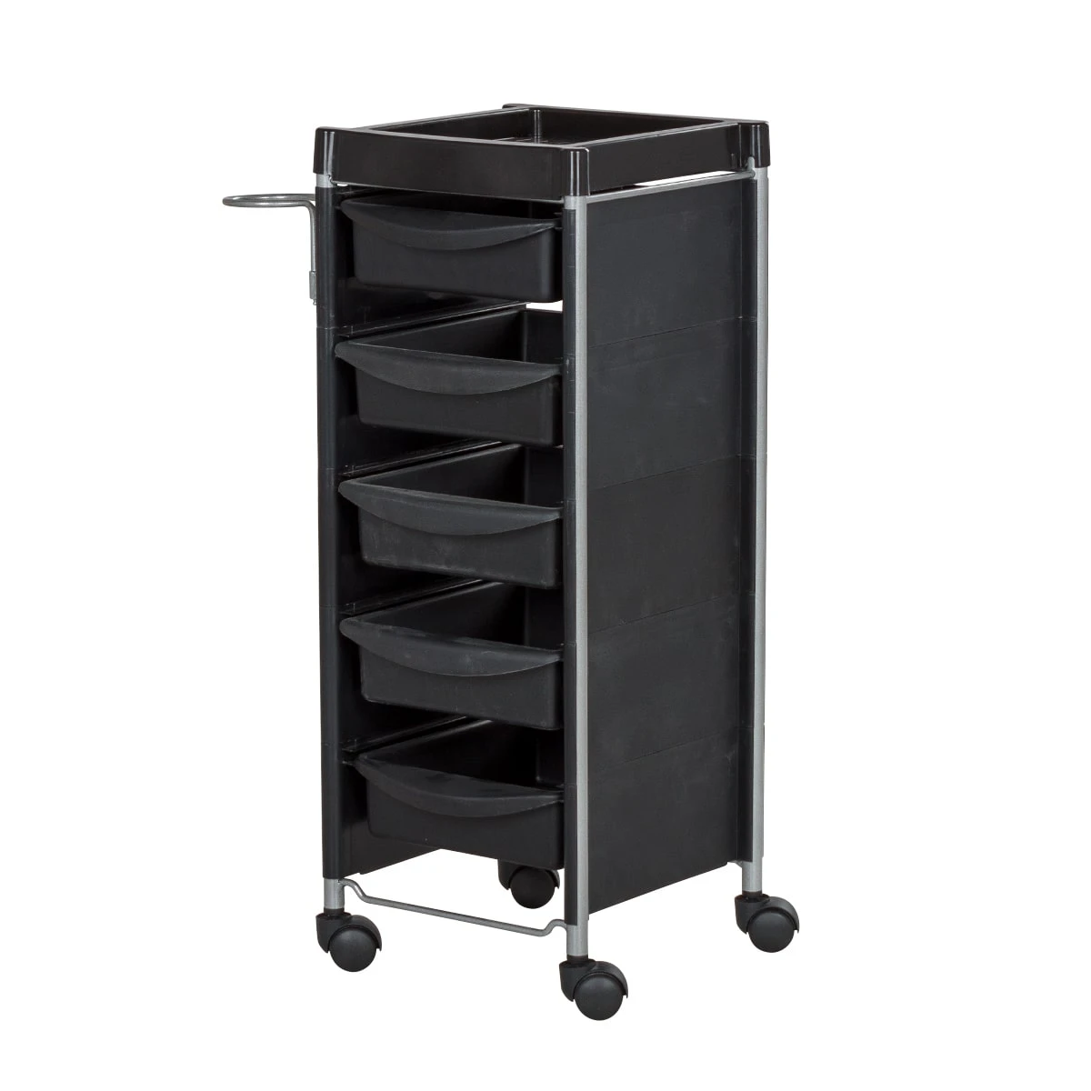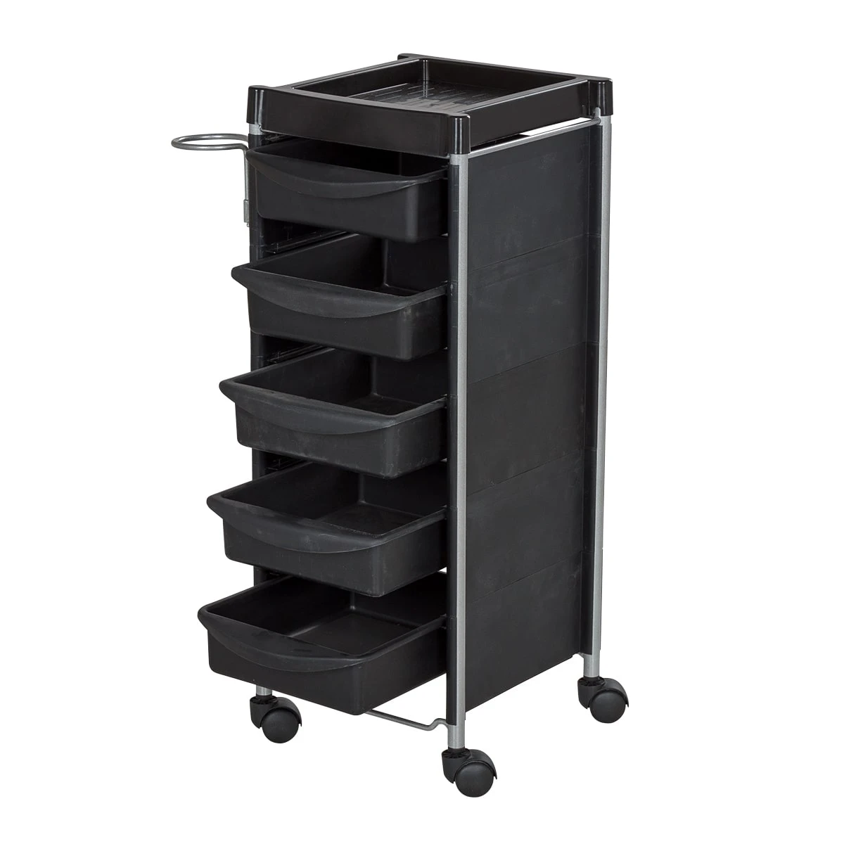 Комплектация: каркас с боковинами на колесах, ящики из пластика (5шт.), пластиковая полочка, держатель для фена, пластиковые боковины.