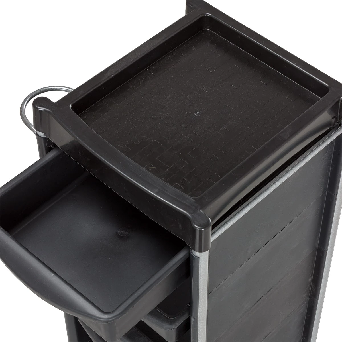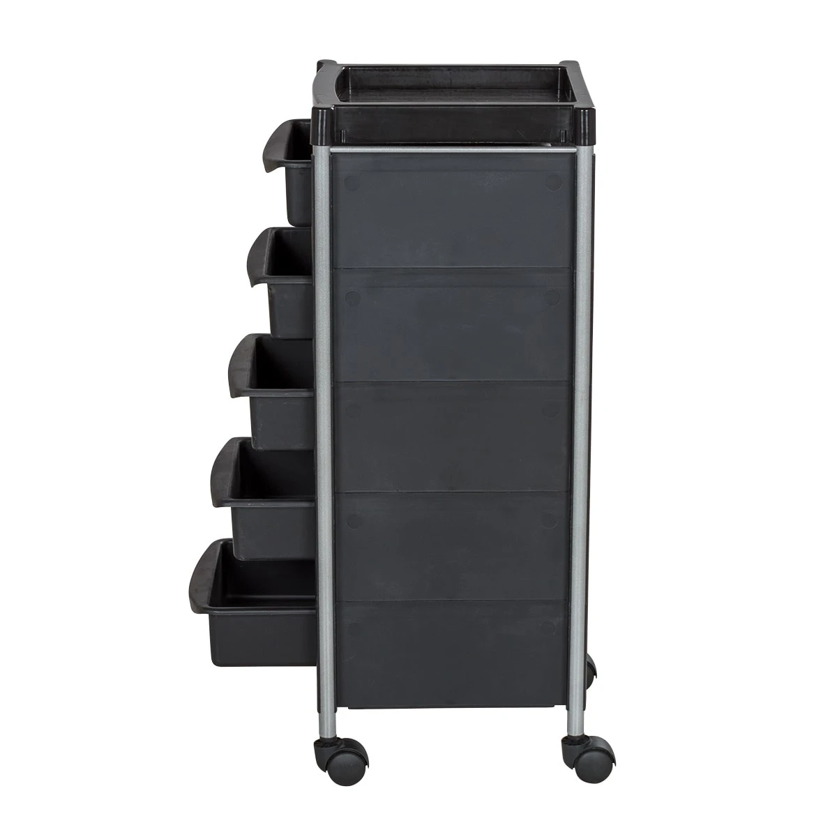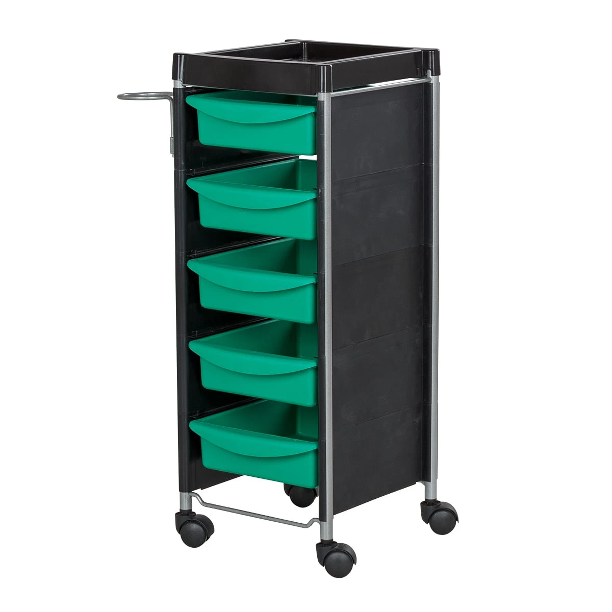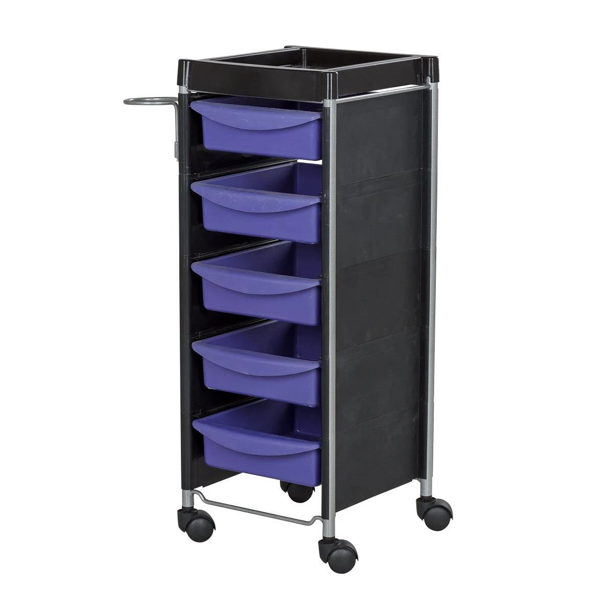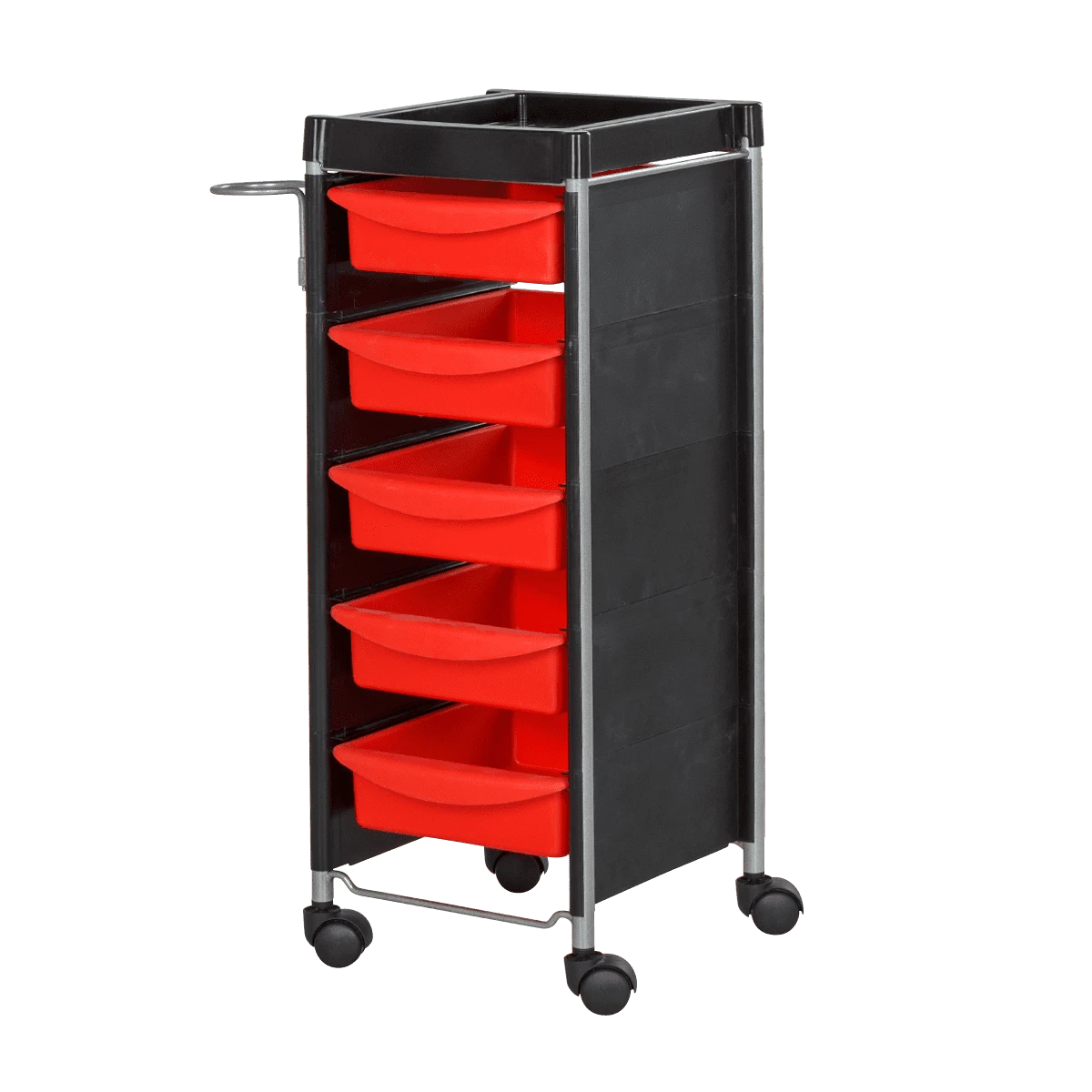 В каталоге нашего магазина Вы можете подобрать и купить парикмахерскую тележку М-04 в черном или другом цвете на выбор. Модели одной серии отличаются только цветом выдвижных ящиков: черный, фиолетовый, зеленый, оранжевый, красный, белый и серебристый.