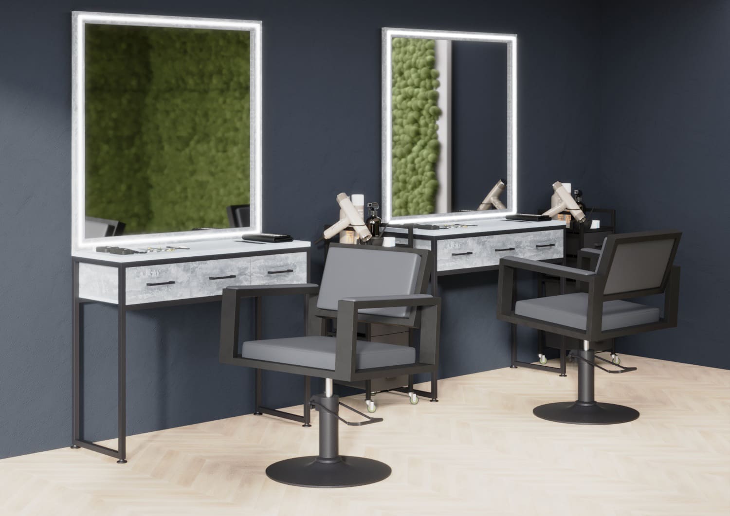 Парикмахерское рабочее место выполнено в современном стиле с гармоничным сочетанием светлого дерева и чёрного металла. Большое зеркало в широкой раме визуально расширяет пространство и позволяет мастеру контролировать процесс работы под любым углом.