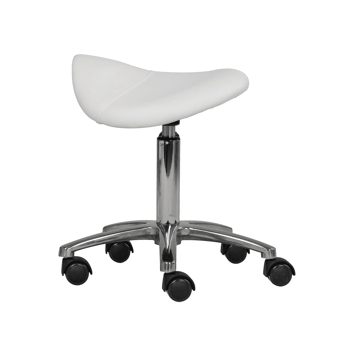 Стулья данной конфигурации, с сиденьем в форме седла, пользуются популярностью среди профессионалов. Такой стул позволяет снизить утомляемость и предотвращает появление болей в спине и ногах на протяжении и после рабочего дня. Неоспоримым преимуществом модели является наличие удобной опоры для ног. Она, как и основание, выполнена из хромированного металла. Без усилий перемещать стул по помещению позволяют легко вращающиеся колеса из прочного черного пластика. Они также обеспечивают устойчивость стула на полу с любой поверхностью.
