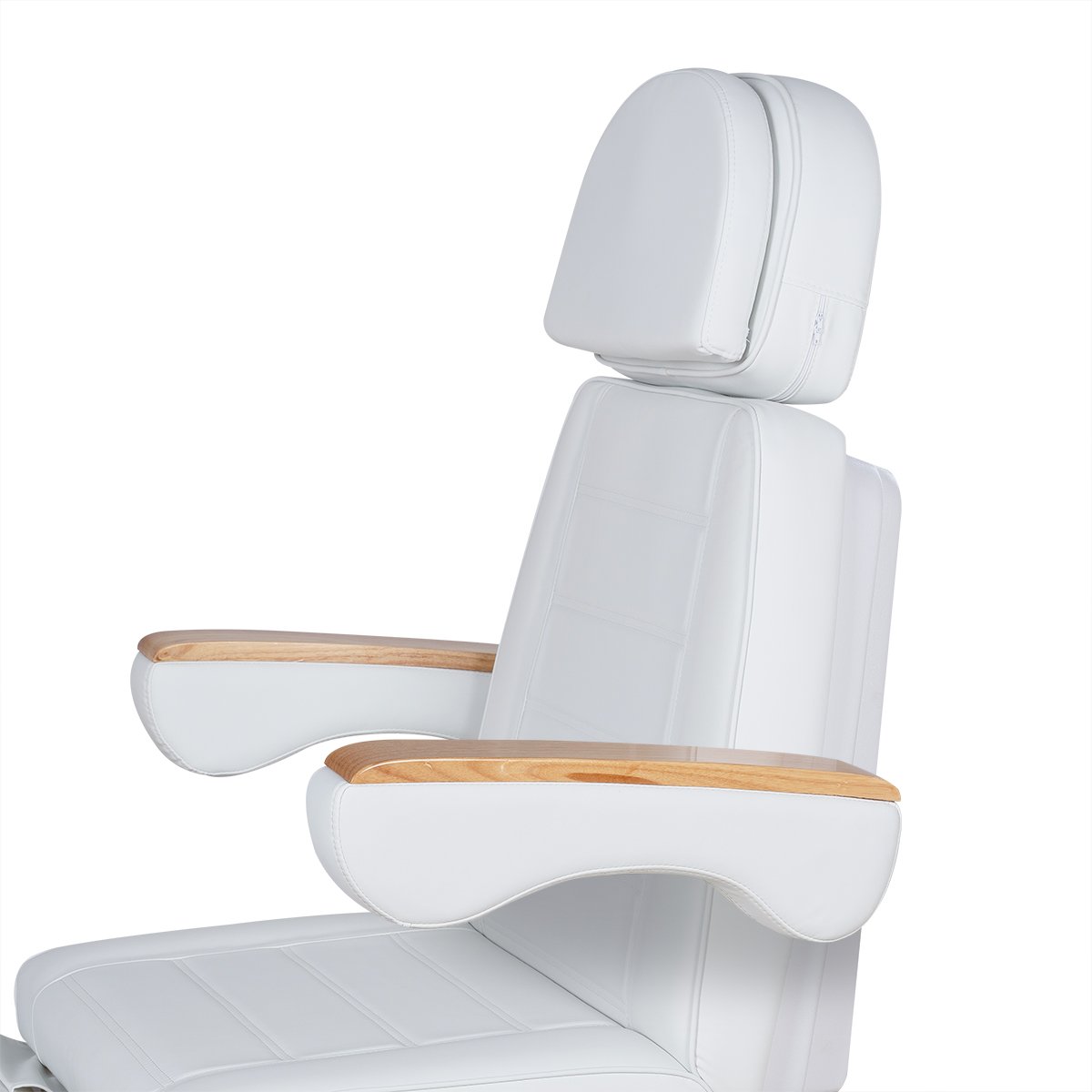 Кресло имеет устойчивое широкое основание, конструкция полностью раскладывается в горизонтальное положение, имеются выдвижной подголовник с отверстием для лица, которое при необходимости можно закрыть мягкой подушкой и съёмные подлокотники со стильными деревянными вставками. Модель можно использовать для различных процедур: педикюр, наращивание ресниц, косметология, оформление бровей и т.д.