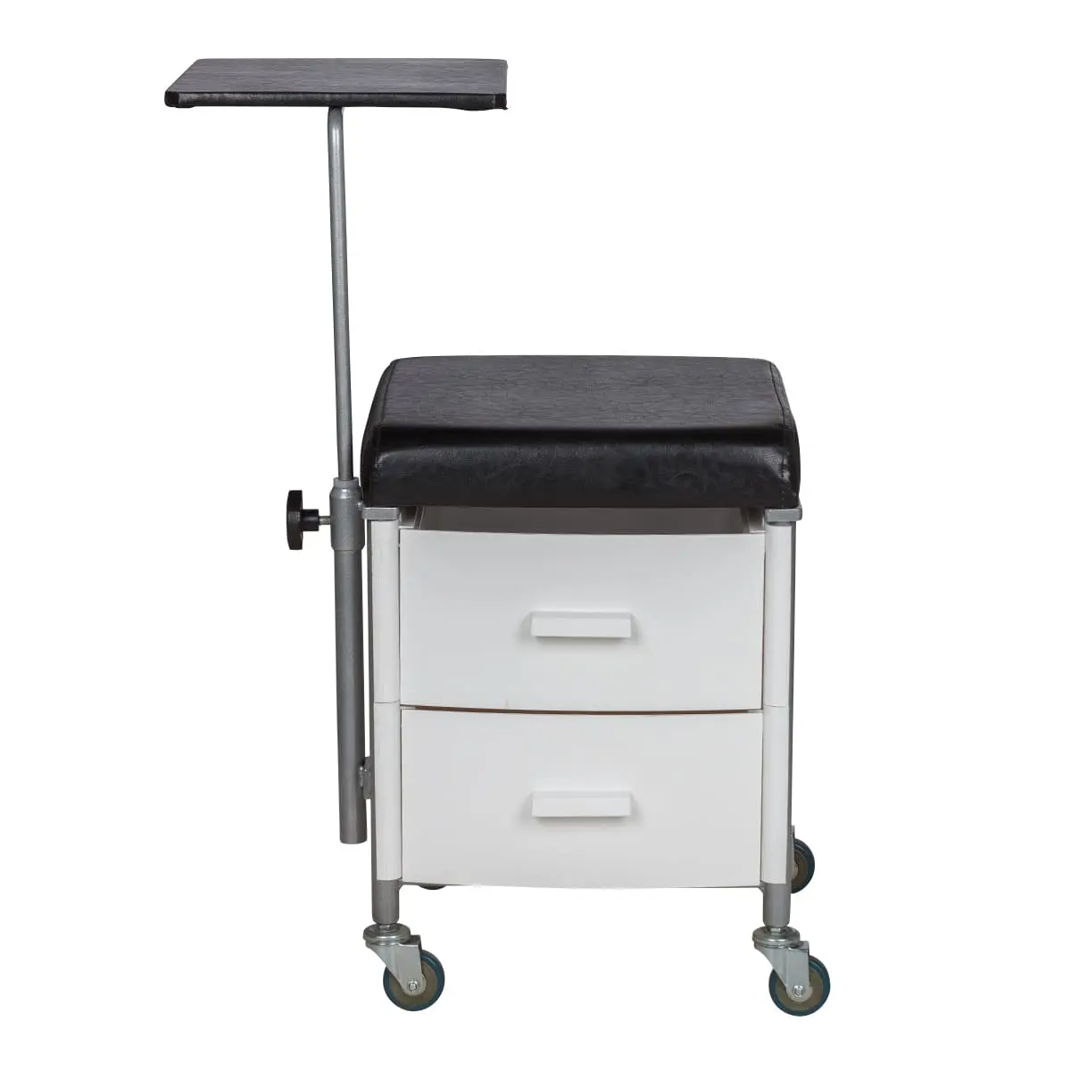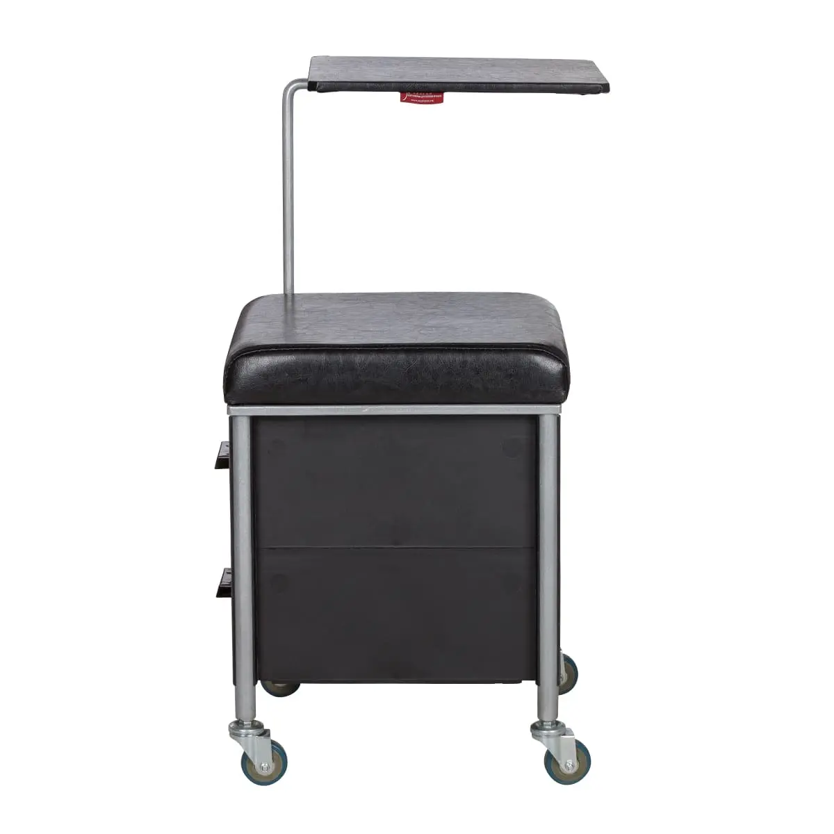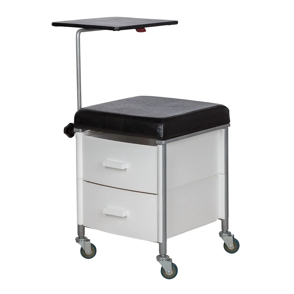 На удобном пуфике мастер может с комфортом провести процедуры. Под сидением предусмотрены два вместительных ящика под необходимые инструменты мастера. Столешницу можно регулировать по высоте, чтобы подобрать оптимальную высоту для работы. Чтобы сэкономить время специалистов, стул для мастера педикюра оснащен поворотными колесами, которые позволят легко перемещаться, не вставая с места.